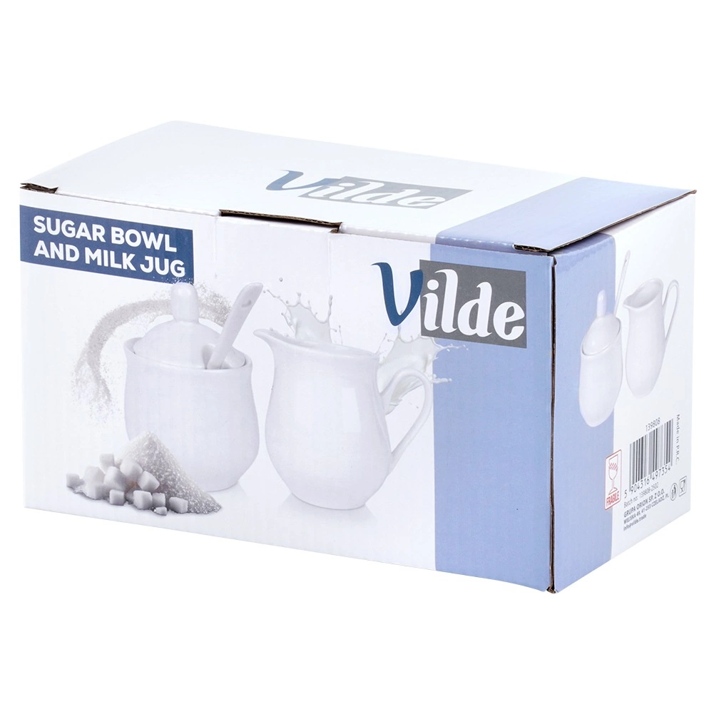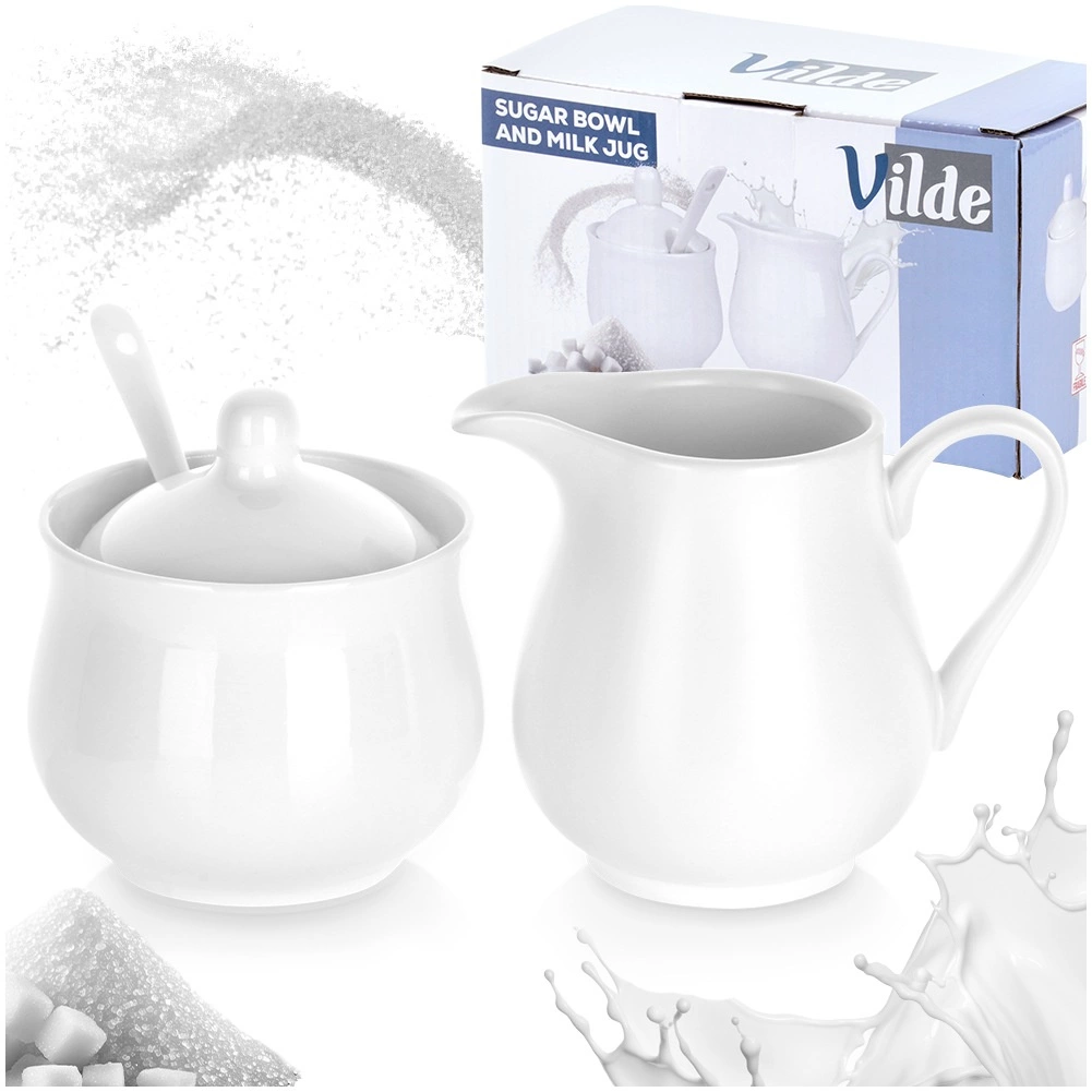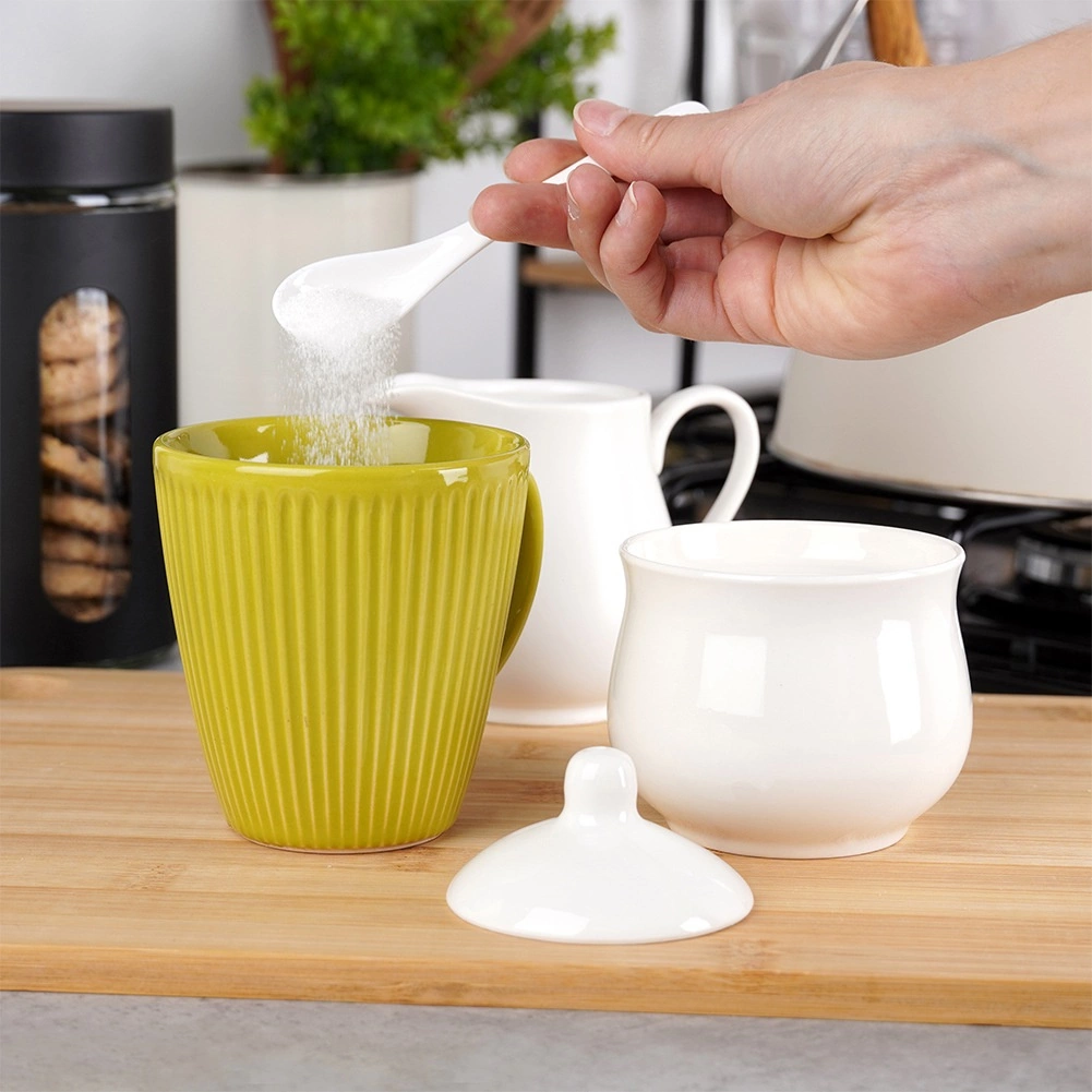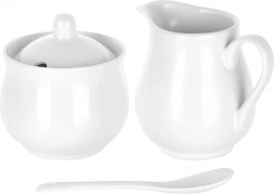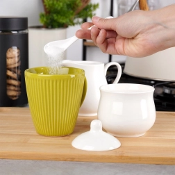 Ovaj dizajnerski set spaja funkcionalnost i čisti izgled porculana. Vrč za mlijeko s ergonomskom ručkom i oblikovanim izljevom omogućuje precizno točenje mlijeka ili vrhnja, a posudica za šećer s poklopcem i praktičnim otvorom za žličicu drži šećer zaštićenim i uvijek pri ruci. Bijela boja se lako uklapa u svaki set posuđa i djeluje savršeno uredno na svakom stolu.