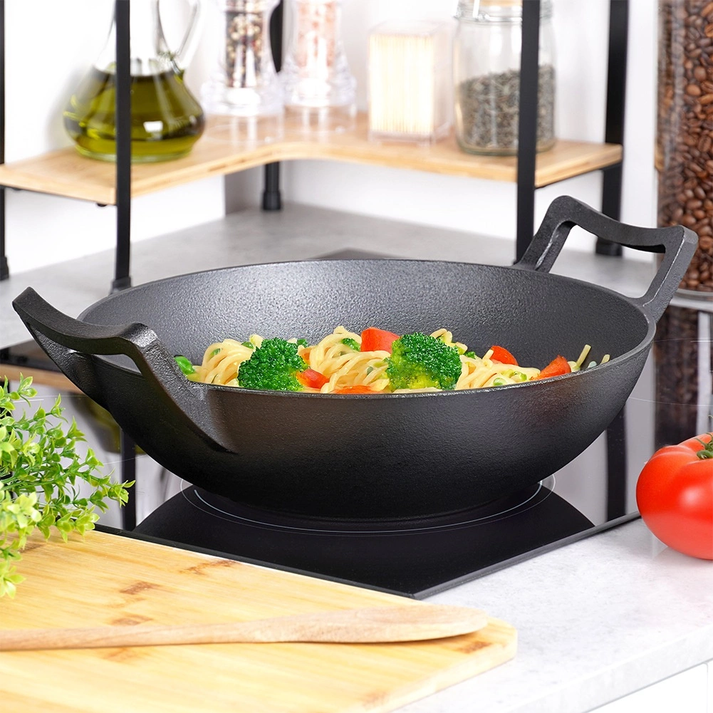 Masivno tijelo od lijevanog željeza osigurava stabilnu temperaturu po cijeloj površini – idealno za brzo stir-fry prženje i postupno pirjanje.