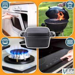 Pogodno za plin, struju, keramiku, halogen, indukciju i za pećnicu. Idealno i za roštilj te otvorenu vatru.