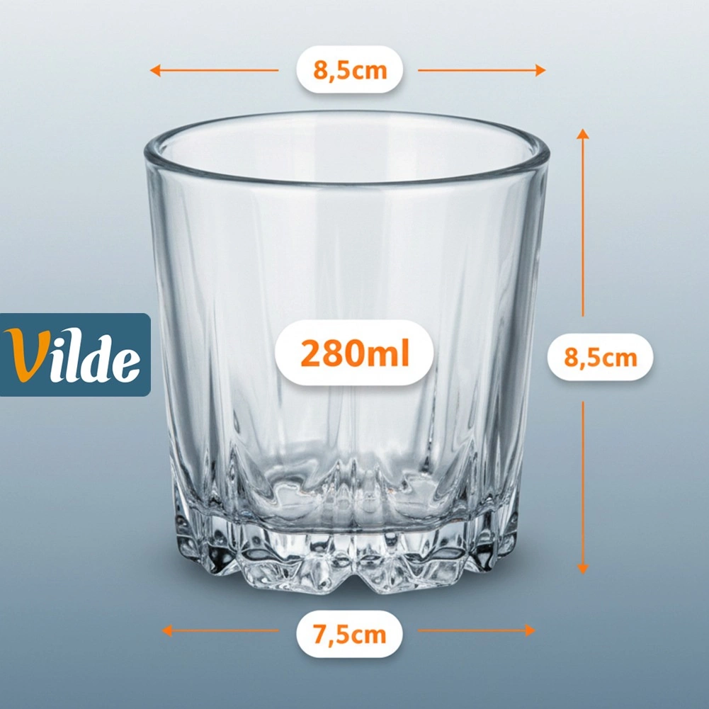 Ovaj set od šest čaša zapremine 280 ml spaja bezvremenski dizajn i praktičnost. Precizne dimenzije 8,5 × 8,5 cm osiguravaju ugodan hvat i stabilnost na stolu, dok debelo dno štiti piće od brzog zagrijavanja od ruke. Prozirno staklo naglašava boju viskija i drugih napitaka te vašem serviranju daje elegantan izgled.