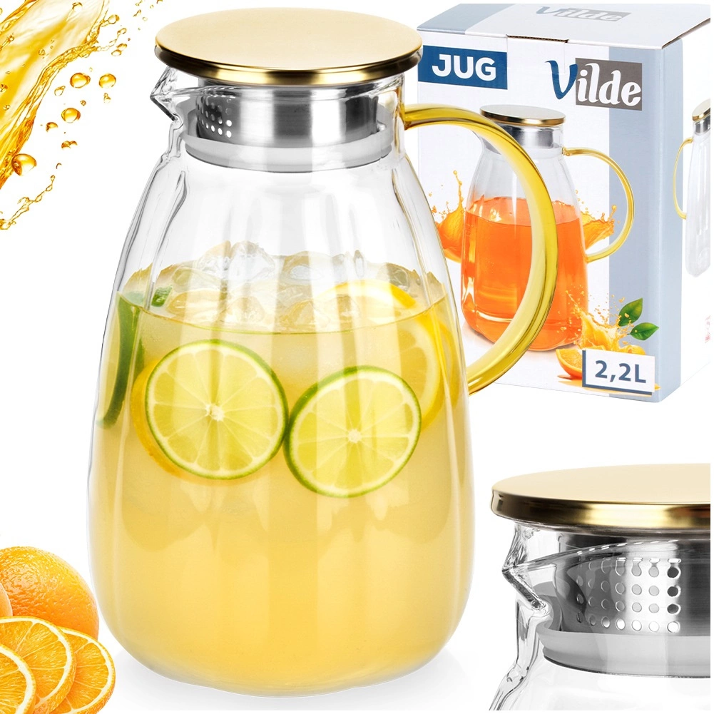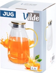 Elegantni stakleni vrč zapremine 2,2 l s poklopcem od nehrđajućeg čelika u zlatnoj nijansi i ergonomskom žutom drškom. Zahvaljujući profiliranom izljevku toči čisto i udobno, idealan je za vodu, limunadu, sokove i ledeni čaj, a svojim užim oblikom stane u vrata hladnjaka. Može se prati u perilici posuđa.