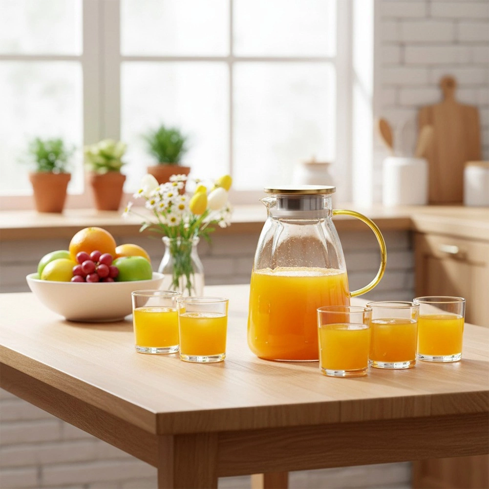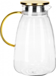 Stilizan i praktičan stakleni vrč koji će se istaknuti na svakom stolu. Prozirno, kvalitetno debelostjenno staklo lijepo ističe kriške limuna, bilje ili kockice leda, dok zlatni poklopac od nehrđajućeg čelika štiti napitak od nečistoća i insekata. Ergonomska žuta drška i oblikovano grlo osiguravaju sigurno i precizno točenje bez kapanja.