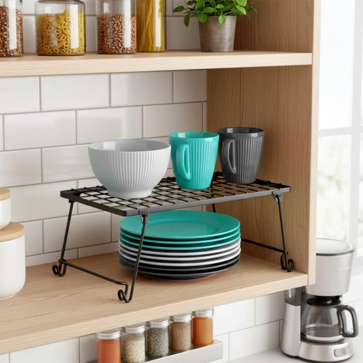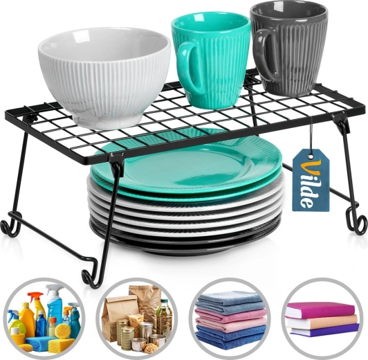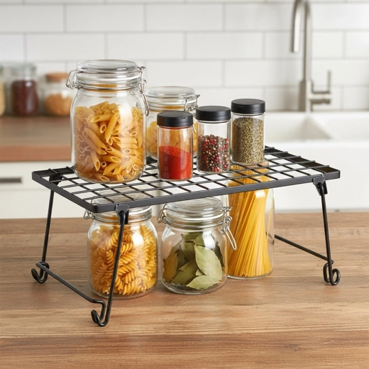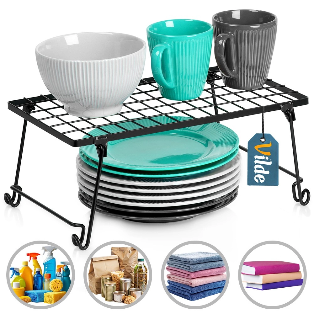 Praktična kuhinjska polica od izdržljivog metala u crnoj boji pomaže boljoj organizaciji prostora. Idealna za začine, tanjure, šalice i zdjele. Zahvaljujući dimenzijama 36 × 22 × 15 cm učinkovito dijeli ormarić na dvije razine i stvara dodatni prostor za odlaganje. Stabilna konstrukcija, sklopivi dizajn i moderan minimalistički izgled uklapaju se u svaki interijer.