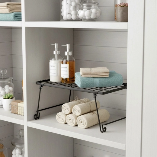 - Ušteda prostora – praktično dijeli ormarić ili policu na dvije razine.