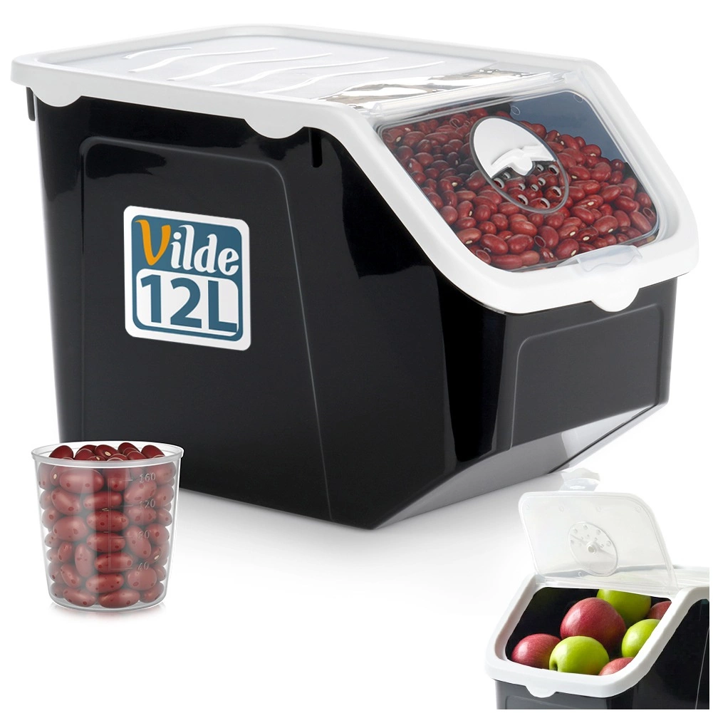 Praktičan kuhinjski spremnik zapremnine 12 l za voće, povrće i rasute namirnice. Ima regulaciju protoka zraka u poklopcu, prozirnu preklopnu klapnu za lako doziranje i brtveni poklopac za dulju svježinu. U pakiranju je mjerica 40–160 ml. Izrađeno od sigurne plastike bez BPA, pogodno za kontakt s hranom, zamrzivač i perilicu posuđa, temperaturna otpornost -20 °C do 100 °C.