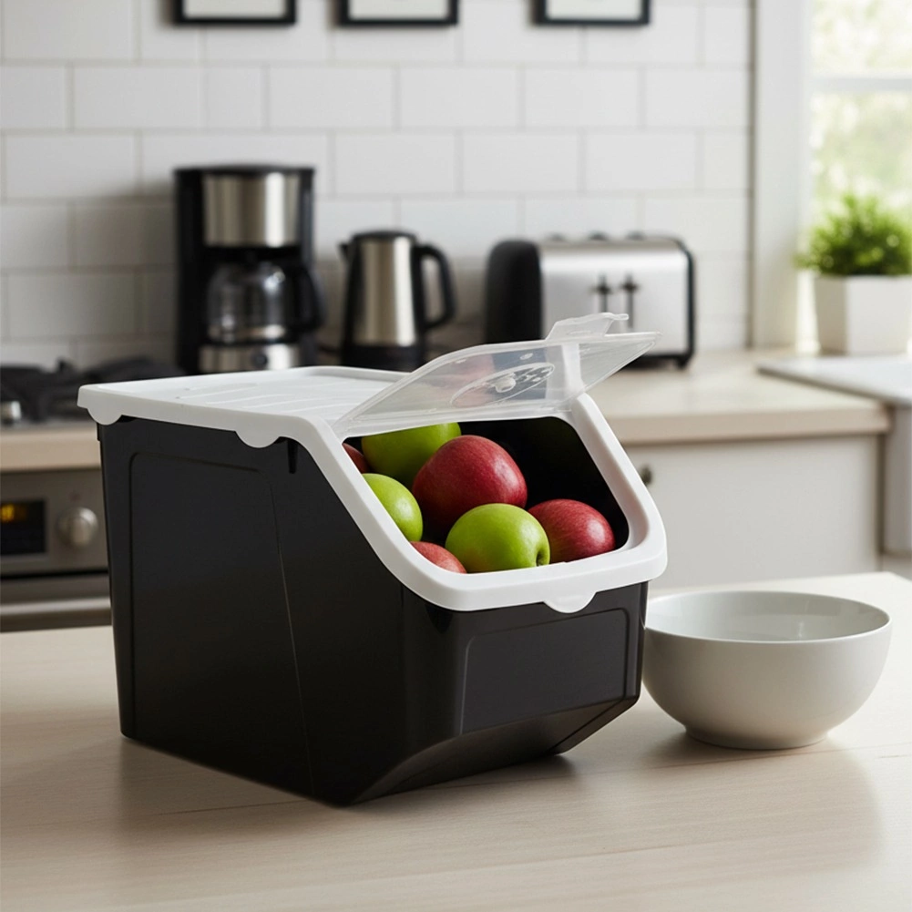 Održavajte red u smočnici i na radnoj plohi s prostranim spremnikom od 12 l. Zahvaljujući prozirnoj preklopnoj klapni brzo provjerite sadržaj i lako uzmete potrebnu količinu. Brtveni bijeli poklopac štiti od vlage i mirisa, dok podesiva ventilacija pomaže održati voće i povrće dulje svježima.