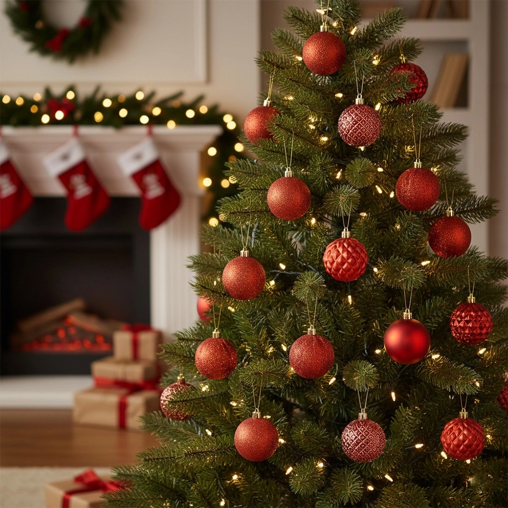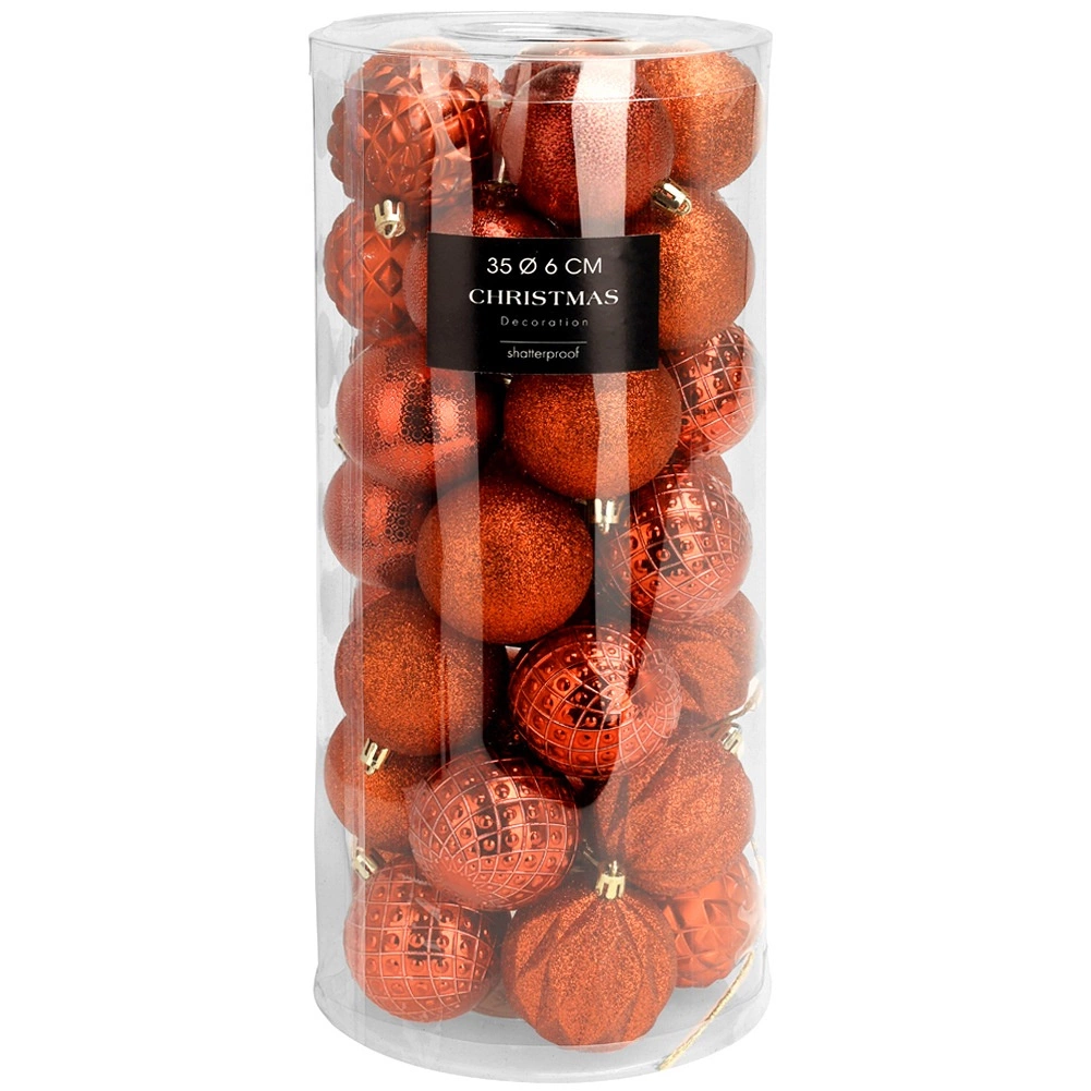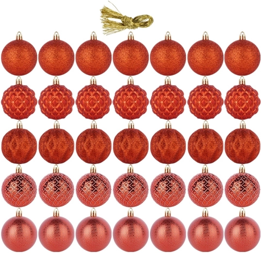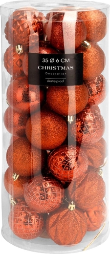 Stilski set od 35 crvenih božićnih kuglica promjera 6 cm za klasičan blagdanski izgled. Kuglice su nerazbijive, idealne za domove s djecom i kućnim ljubimcima. Različite površinske obrade – sjaj, mat i glitter – osiguravaju efektnu i raznoliku dekoraciju drvca, vijenaca i girlandi.