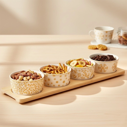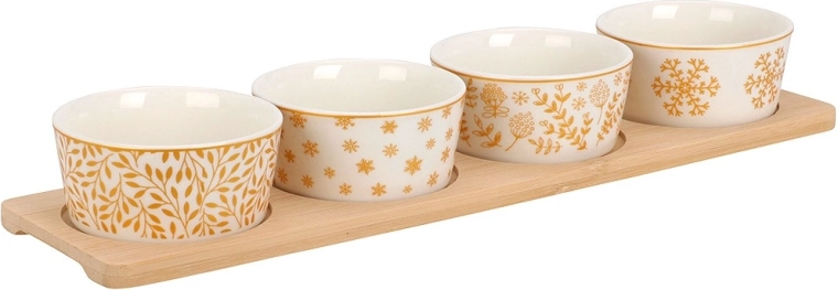 Elegantni set od 5 dijelova za posluživanje sadrži bambusovu pladnju i četiri porculanske zdjelice s raznim zimskim motivima. Idealan za orašaste plodove, masline, umake i dipove te druge male poslastice. Stabilna pladnja s udubljenjima sprječava klizanje zdjelica, a porculan je pogodan za perilicu posuđa. Kompaktne dimenzije olakšavaju stilsko posluživanje tijekom blagdanskih druženja.