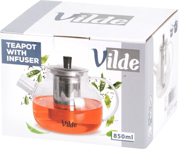 Elegantni stakleni čajnik s infuzerom zapremine 850 ml za udobnu pripremu čaje, biljaka i napitaka bez taloga. Izrađen od borosilikatnog stakla i nehrđajućeg čelika za veću izdržljivost, čist okus napitka i jednostavno čišćenje. Idealan za svakodnevnu upotrebu kod kuće i u uredu.