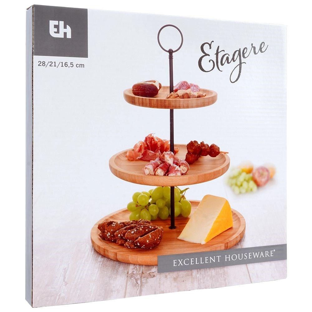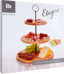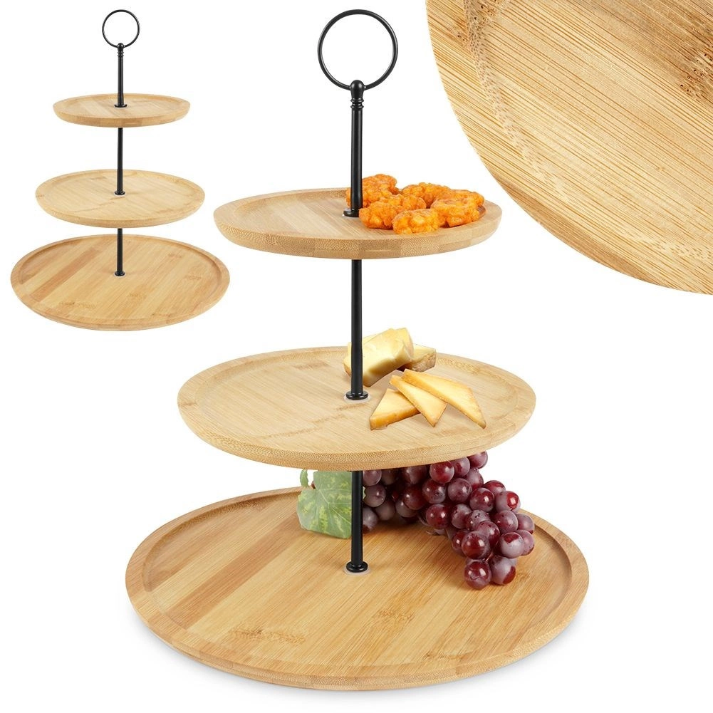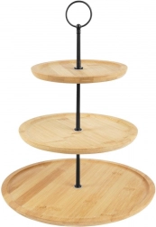 Stalak čine tri okrugla pladnja različitih promjera, koji stvaraju skladan i pregledan display. Prirodni bambus je lagano, izdržljivo i higijensko drvo, a metalni spojevi osiguravaju stabilnost. Za dug vijek preporučujemo ručno čišćenje i ne prati u perilici posuđa.