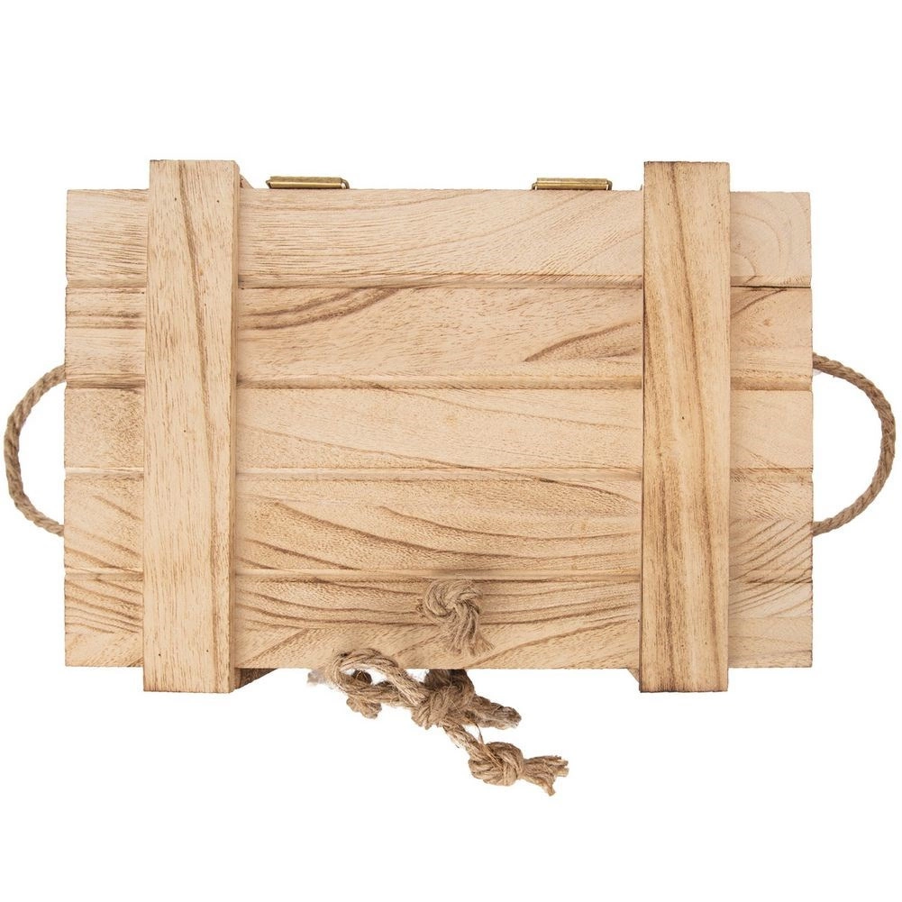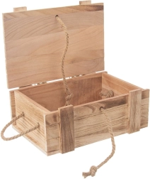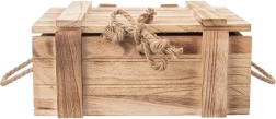 Svestrana drvena spremna kutija s rustikalnim izgledom izvrsno se uklapa u moderan i rustikalni interijer. Zahvaljujući poklopcu na šarkama i jutenom vezanju sigurno skriva dokumente, igračke, sitnice i obiteljske suvenire. Prirodno drvo daje kutiji bezvremenski stil i dug vijek trajanja.