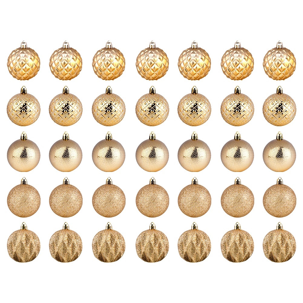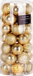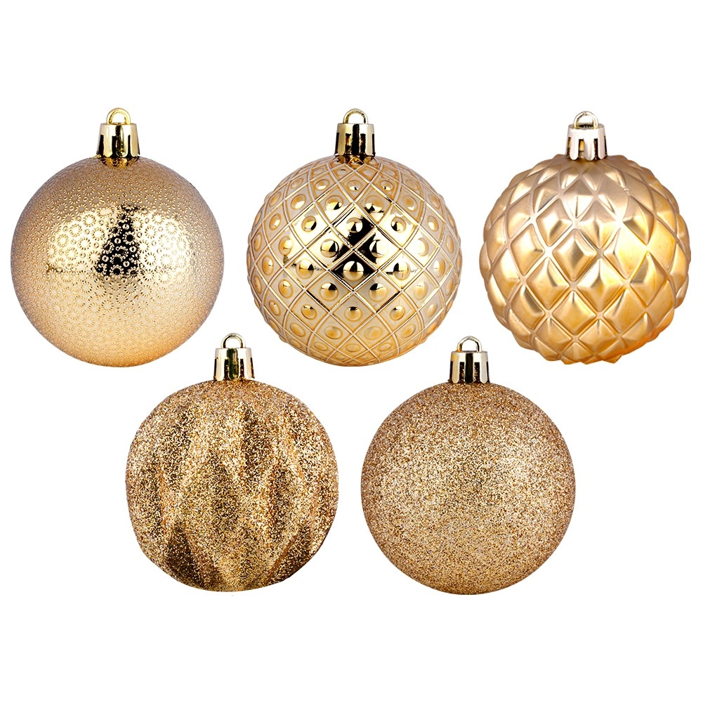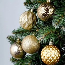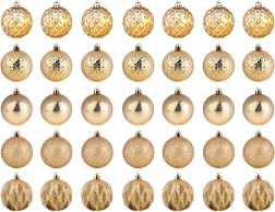 Stvorite čarobnu blagdansku atmosferu sa stilskim setom zlatnih kuglica koje kombiniraju različite teksture i efekte za bogat, vizualno atraktivan izgled. Od glatkog sjaja preko mata do blistavog brokata i plastičnih reljefa – svaki komad vašoj božićnoj dekoraciji daje jedinstven karakter.