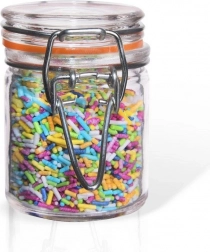 Staklenka je izrađena od kvalitetnog debelog stakla, klip od izdržljivog metala, a narančasta gumena brtva omogućuje pouzdano zatvaranje. Zahvaljujući elegantnom izgledu prikladna je i kao dekorativna ambalaža za domaće poklone, primjerice za džemove ili aromatizirane soli.