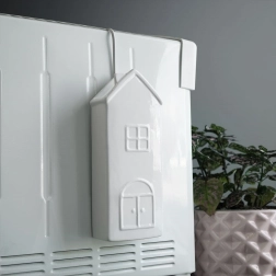 Elegantni keramički ovlaživač zraka za radijator u obliku kućice s volumenom od 300 ml pomaže održavati optimalnu vlažnost tijekom sezone grijanja. Zahvaljujući jednostavnom vješanju na metalnu kukicu i lakom korištenju dovoljno je samo doliti vodu. Bijela glazura i dekorativni dizajn uklapaju se u svaki interijer. Kvalitetna keramika osigurava dug vijek trajanja i siguran rad.