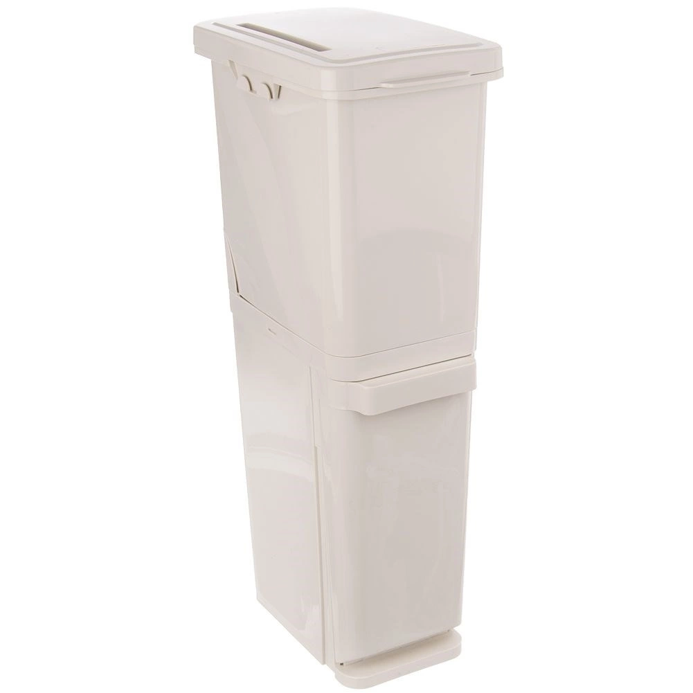 Dvorazinsko rješenje omogućuje uporabu posuda zajedno, jednu iznad druge, ili zasebno. Zahvaljujući uskom profilu kanta stane ispod standardnih ormarića, što štedi prostor u kuhinji, uredu ili čekaonici. Svaka posuda ima neovisni poklopac – donja se otvara preklopom prema naprijed, gornja se otvara odozgo.