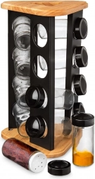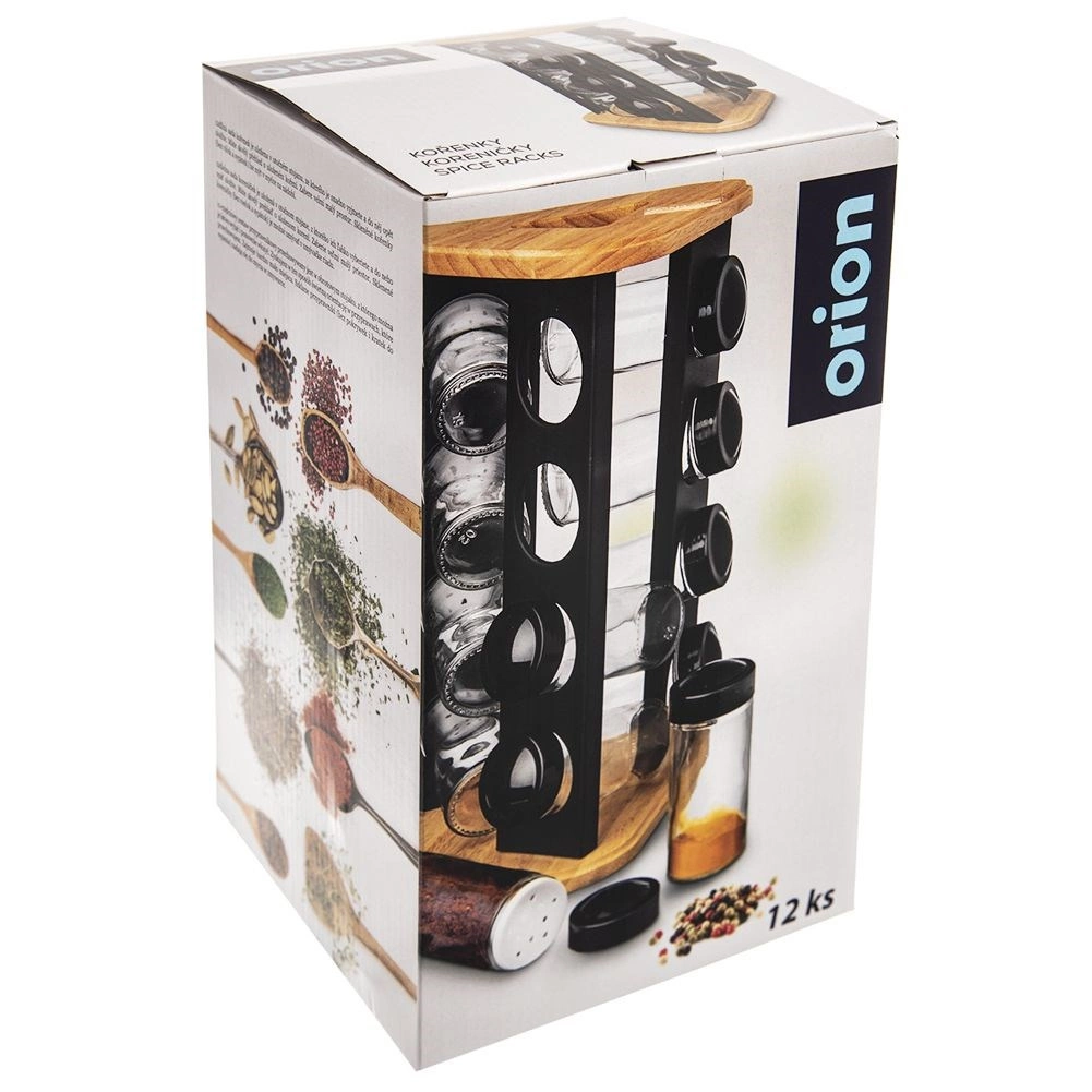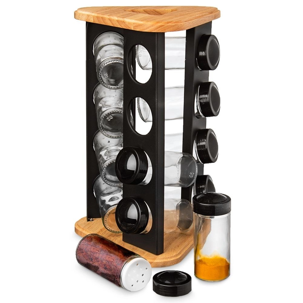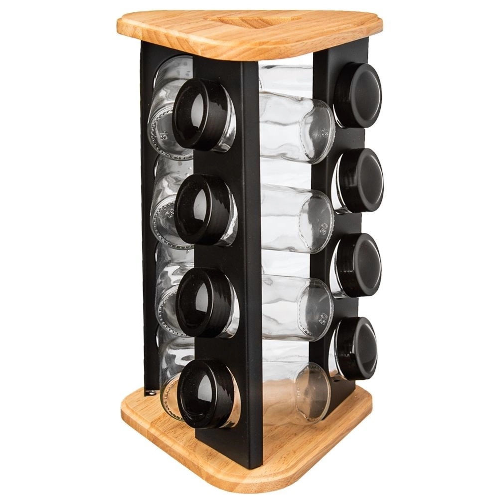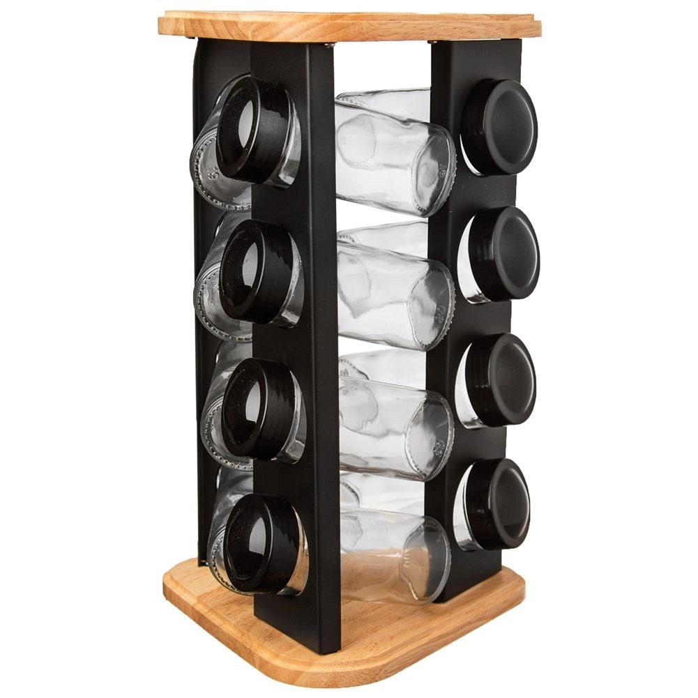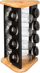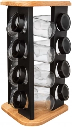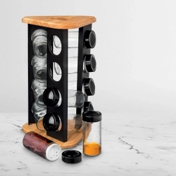 Stalak od drva i čvrstog crnog metala izdržljiv je i stabilan, a prozirno staklo omogućuje kontrolu sadržaja na prvi pogled. Stakleni dijelovi (bez poklopaca) mogu se prati u perilici posuđa. Minimalistički dizajn uklapa se u svaku kuhinju i pomaže održati red te lijepu prezentaciju omiljenih začina.