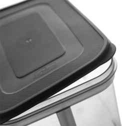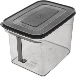 Praktičan spremnik za rasute namirnice s poklopcem i bočnom ručkom za jednostavno prenošenje. Idealan za brašno, šećer, sol, griz ili žitarice. Ima volumen 3,25 l i dimenzije 23 × 15,5 × 15,5 cm. Izrađen od izdržljive, prozirne tamnosive plastike koja omogućuje brzu kontrolu sadržaja. Skladištenje bez vlage, brtveni poklopac, prikladno za perilicu posuđa, mikrovalnu bez poklopca i zamrzivač.