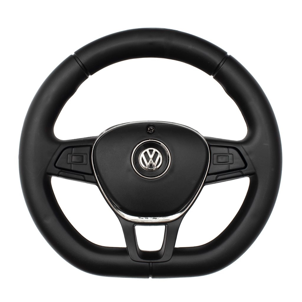 Za mlađu djecu služi vodilica za udobno upravljanje od strane roditelja, dok će stariji vozači cijeniti mogućnost samostalne vožnje otiskivanjem. Trokračni volan s VW logotipom ima trubu i vesele melodije (napajanje 2× AA, nisu uključene). Praktičan spremnik ispod sjedala prima sitnice za put, dok sklopivi oslonci za noge i uklonjivi nasloni za ruke dodaju na udobnosti.