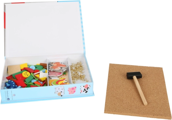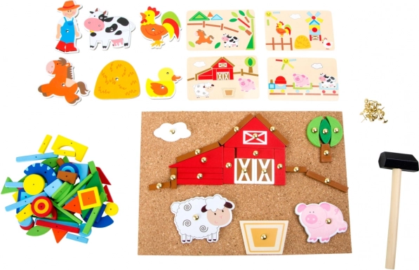 Djeca slažu i zakucavaju oblike na plutnu ploču, čime uvježbavaju koordinaciju, preciznost i maštu pri stvaranju prizora s farme.