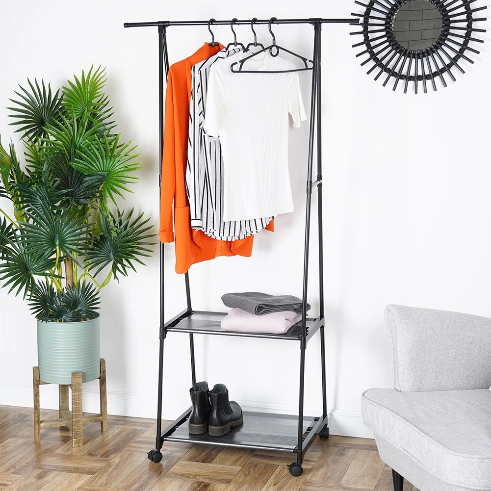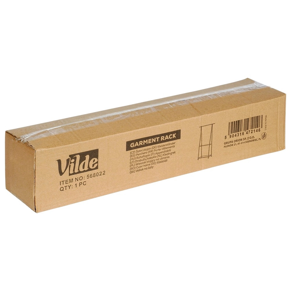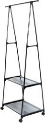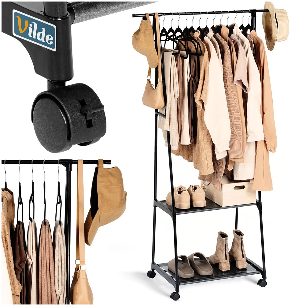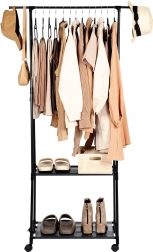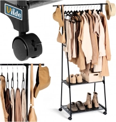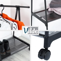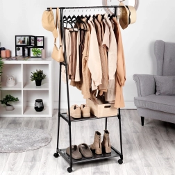 Elegantna vješalica u industrijskom loft stilu nudi prostranu gornju šipku za vješanje odjeće i dvoje donjih polica za cipele, torbe ili spremnike. Cjelometalna izvedba u crnoj boji je čvrsta, stabilna i jednostavna za održavanje, a tekstilne police od poliestera su lagane i izdržljive.