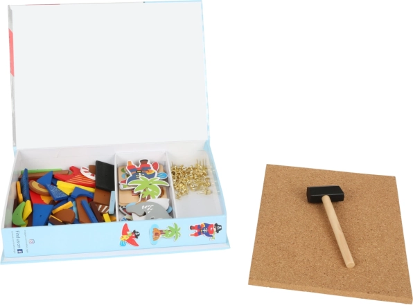 - drveni dijelovi s piratskim motivima, zlatne pribadače, elastična pluto ploča, drveni čekić, 4 obostrane kartice s prijedlozima, kutija za pohranu