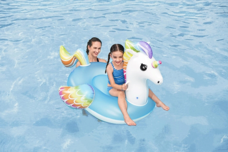 Jednorog je idealan za bazen, jezero i more. Lako se napuhuje, lagan je za prenošenje, a u pakiranju ćete naći i zakrpu za brzu popravku manjih oštećenja. Zahvaljujući nosivosti od 45 kg namijenjen je jednom djetetu od 3 godine naviše.