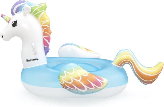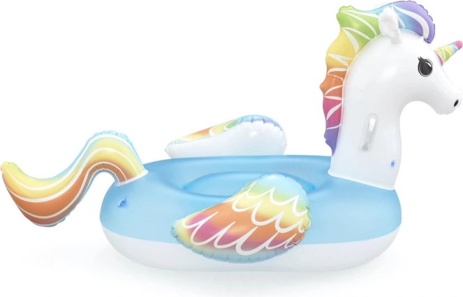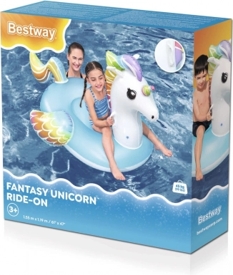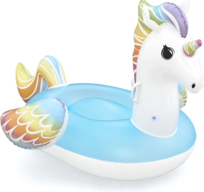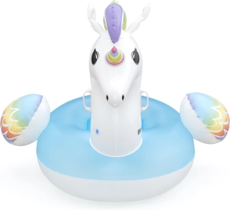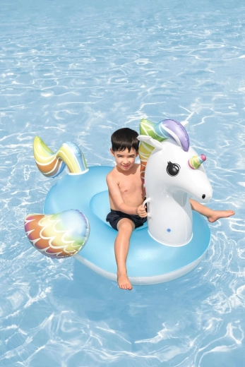 Napuhujući jednorog Bestway oduševit će živopisnim duginim bojama i udobnim plavim sjedalom. Zahvaljujući širokoj osnovi i dvjema čvrstim ručkama djeca se pri igri u vodi osjećaju sigurno i ugodno. Kvalitetan PVC materijal odolijeva redovitoj upotrebi, pa ćete uživati u ljetu bez briga.