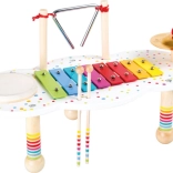 Stolić sadrži četiri omiljena zvučna elementa – ksilofon s obojenim pločicama, bubanj, trokut i činelu. Sviranje potiče koordinaciju ruka–oko, koncentraciju i slušnu percepciju. To je razigran uvod u svijet glazbe koji potiče maštu i samostalnu igru.