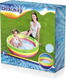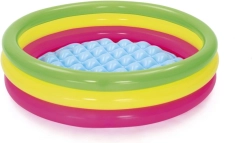 Lagan i kompaktan bazen promjera 102 cm i visine 25 cm odličan je izbor za djecu od 2 godine. Tri šarena prstena s odvojenim ventilima osiguravaju stabilnost i sigurnost pri igri, dok napuhano dno pruža dodatnu udobnost i na tvrđim podlogama. Kapacitet od 62 litre taman je za ugodno hlađenje i prve vodene igre.