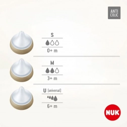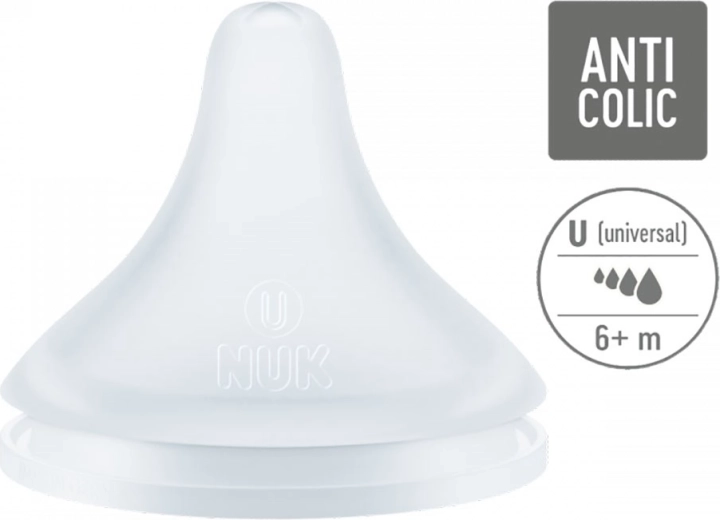 NUK Perfect Match Universal dizajniran je za prirodan i siguran prijelaz između dojenja i hranjenja na bočicu. Mekani silikonski materijal nježan je prema osjetljivim desnima, a glatko suženi oblik podržava pravilno sisanje. Zahvaljujući antikoličnoj funkciji osiguran je neometan i ujednačen protok, koji pomaže spriječiti nadutost.