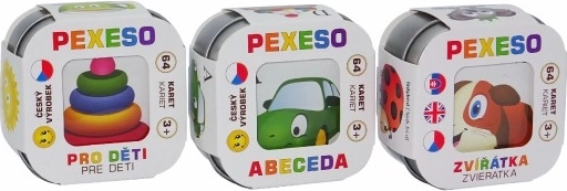 Pexeso je jedna od najomiljenijih dječjih igara, koja dodatno pomaže u razvoju djece. Ovaj set sadrži tri različita pexesa u limenim kutijama, usmjerena na abecedu, životinje s engleskim jezikom i igre za djecu.