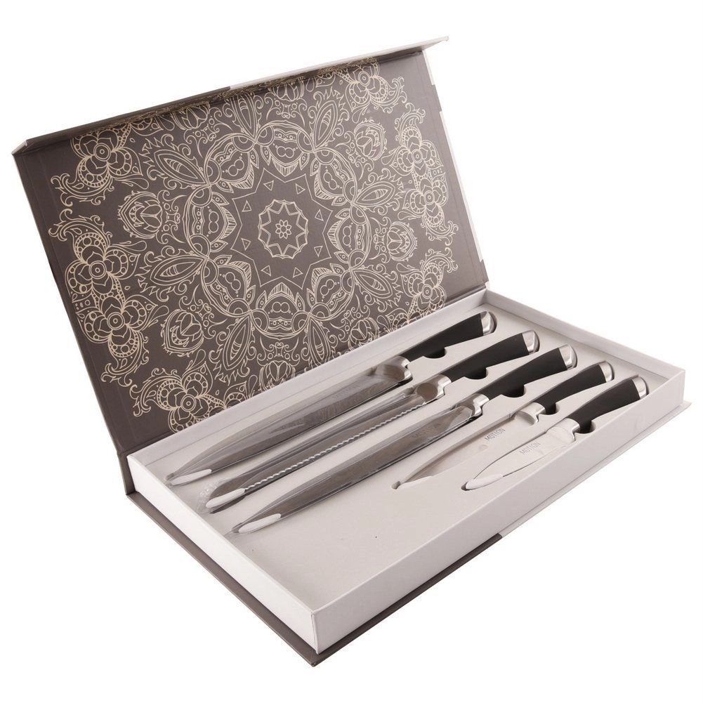 U pakiranju se nalazi pet noževa različitih duljina za precizno i učinkovito rezanje voća, povrća, mesa i kruha. Bezvremenski, klasičan dizajn uklapa se u svaku kuhinju, a set je i odlična ideja za poklon. Originalan proizvod češkog brenda ORION, izrađen prema europskim standardima.
