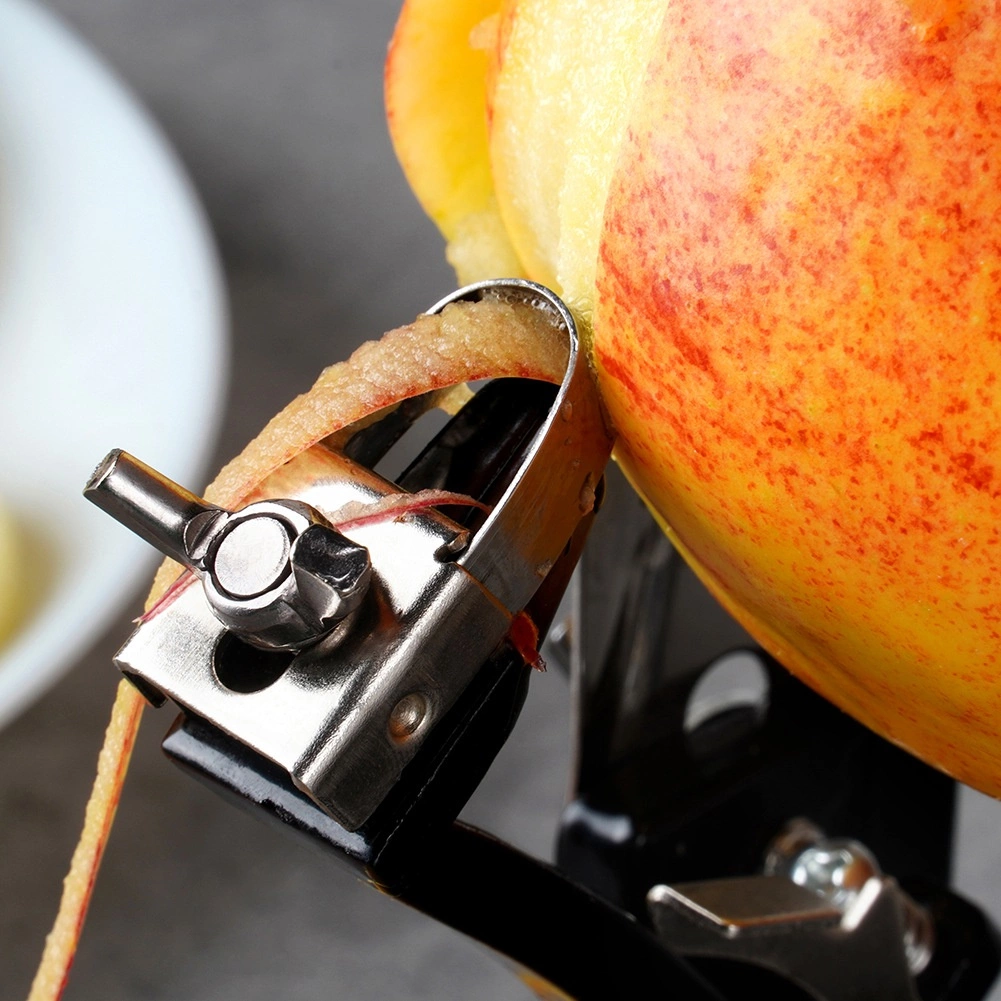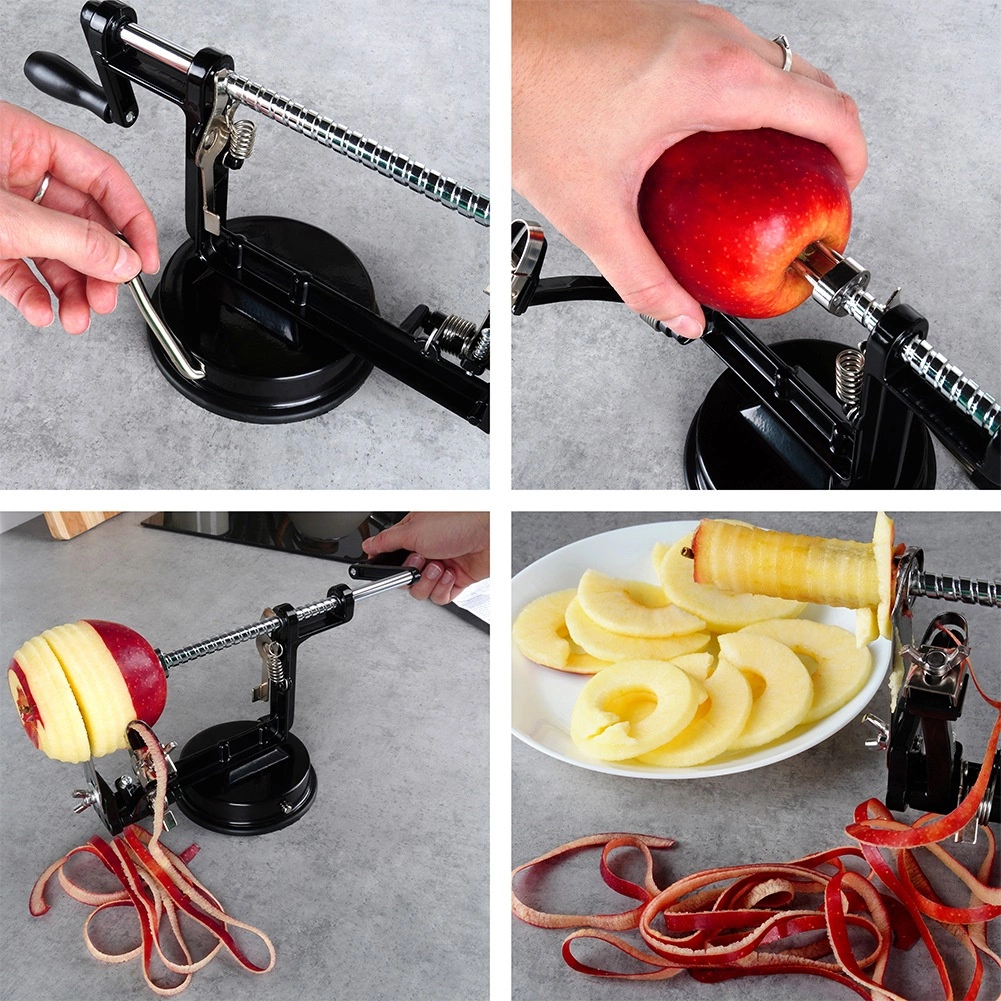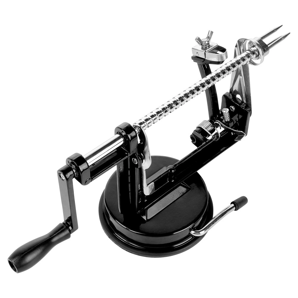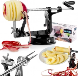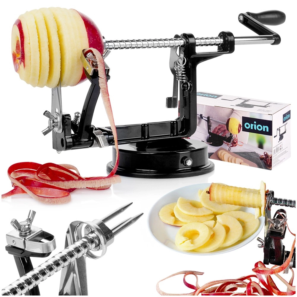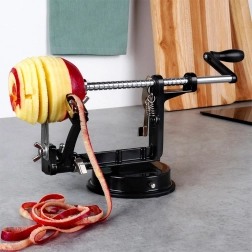 Praktičan kuhinjski pomoćnik koji u jednoj operaciji oguli, izvadi sredinu i nareže jabuke, kruške ili krumpire na efektné spirale. Zahvaljujući preciznom vođenju i oštrim noževima dobit ćete pravilne ploške idealne za savijače, hrskave čipseve, sušenje ili dekorativno posluživanje.