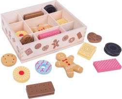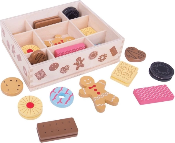 Predstavljamo drvenu kutiju s igračkama kolačića, koja sadrži izbor omiljenih kolačića, uključujući medenjake i druge delicije. Ovaj set omogućuje maloj djeci da razvijaju svoju kreativnost kroz igru inspiriranu pečenjem.