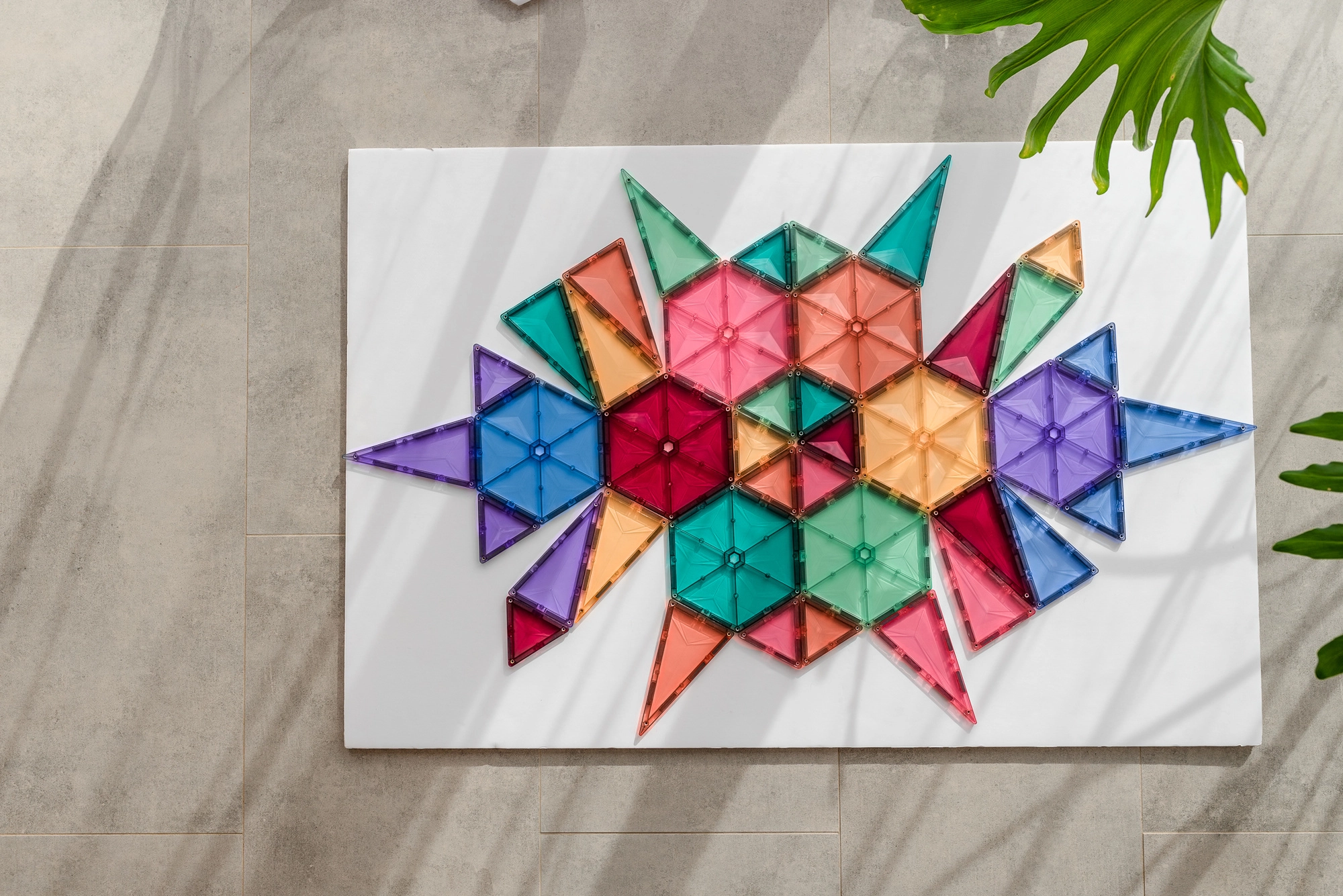 Translucentni geometrijski oblici u nježnim bojama potiču stvaranje uzoraka, istraživanje svjetla i boja te upoznavanje geometrije na zabavan način.