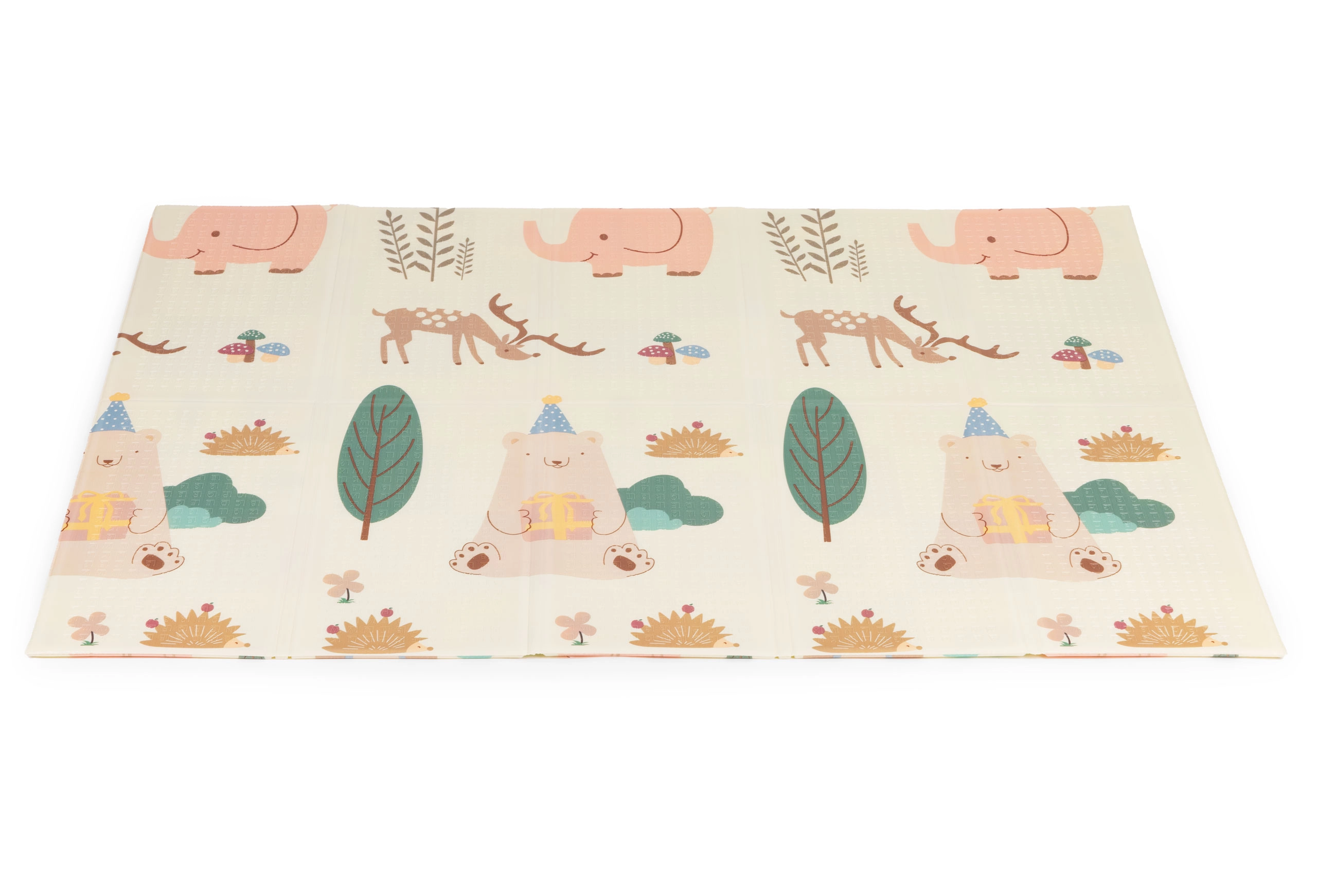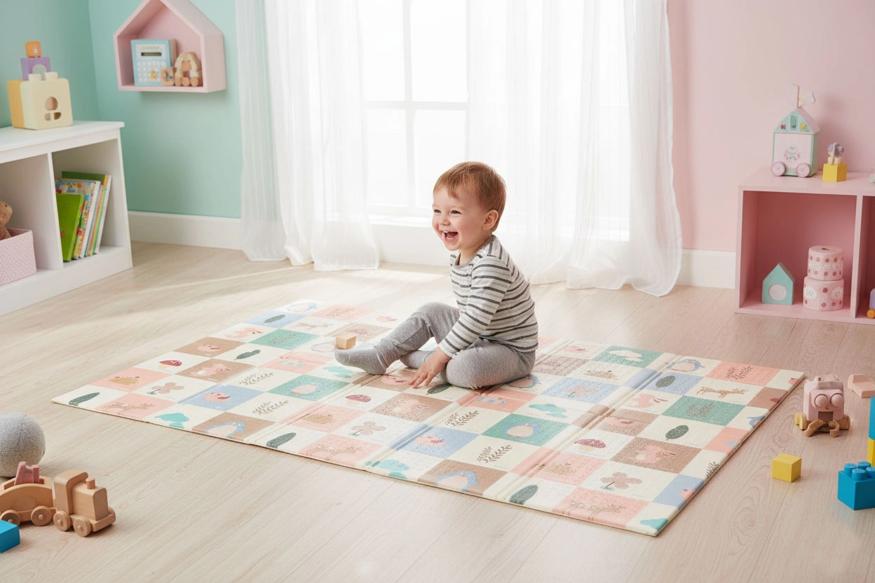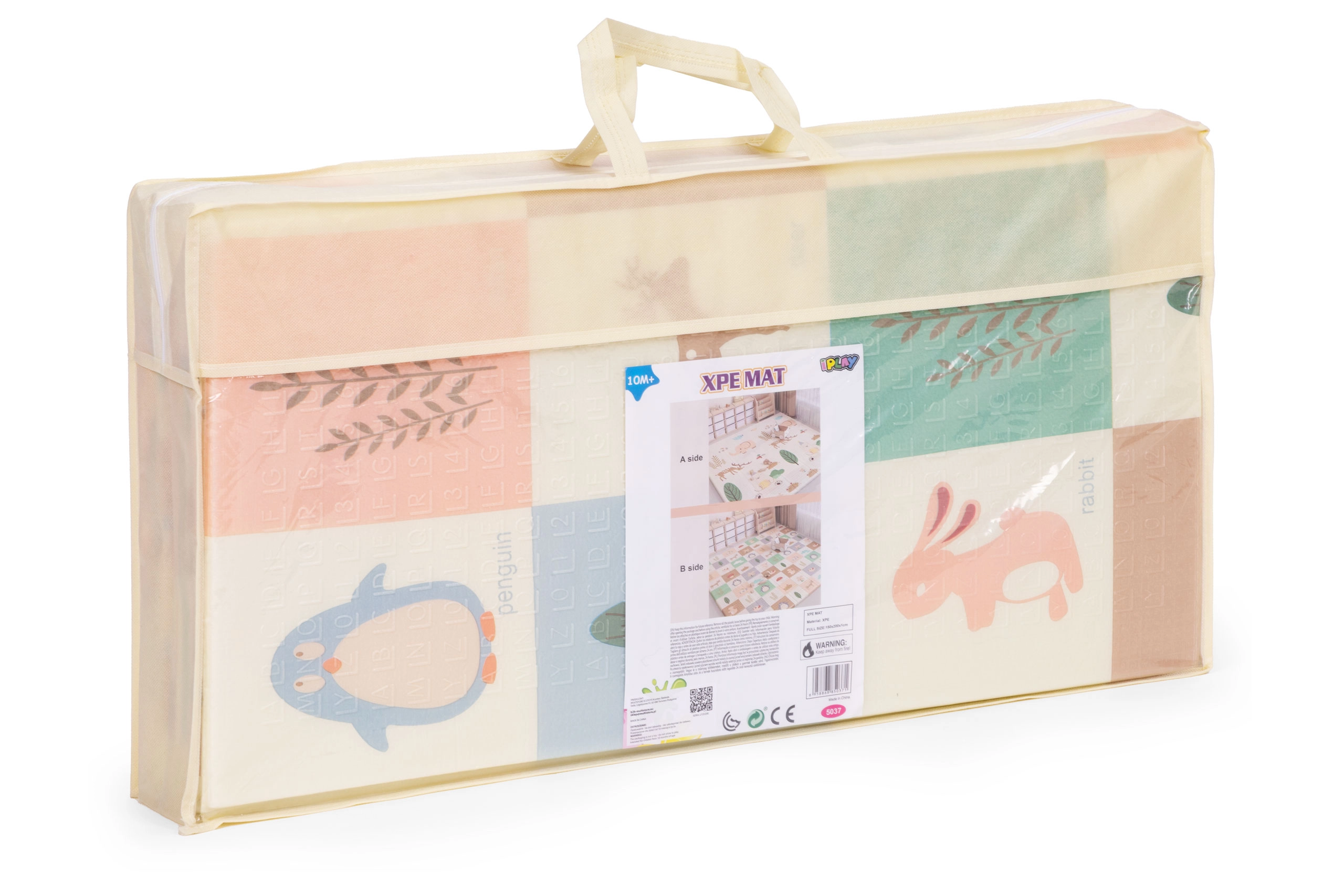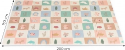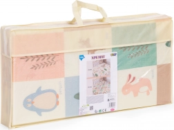 Podloga je lagana, sklopiva i dolazi s prijenosnom torbom, pa je lako prenosite između prostorija, ponesete u vrt ili na odmor. Vodootporna, periva površina podnosi svakodnevnu upotrebu i brzo čišćenje. Zahvaljujući dimenzijama 200 × 150 cm i debljini 1 cm pruža dovoljno prostora i udobnosti za bebe i mališane.