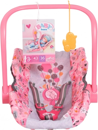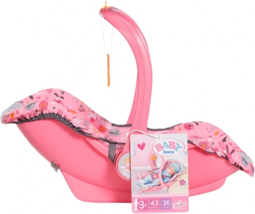 Ova stilizirana ružičasta autosjedalica i nosiljka za lutke BABY born namijenjena je djeci od 3 godine. Zahvaljujući čvrstom plastičnom kućištu, mekom presvlakom i sigurnosnom remenu, pruža lutki udobnost i potporu pri nošenju i odmoru. Okretno držalo omogućuje brzu promjenu načina od nošenja do sjedenja ili njihanja.