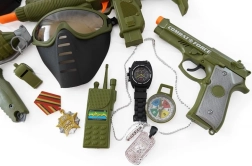 Set za malog vojnika s kacigom, pištoljem i dodatnom opremom.