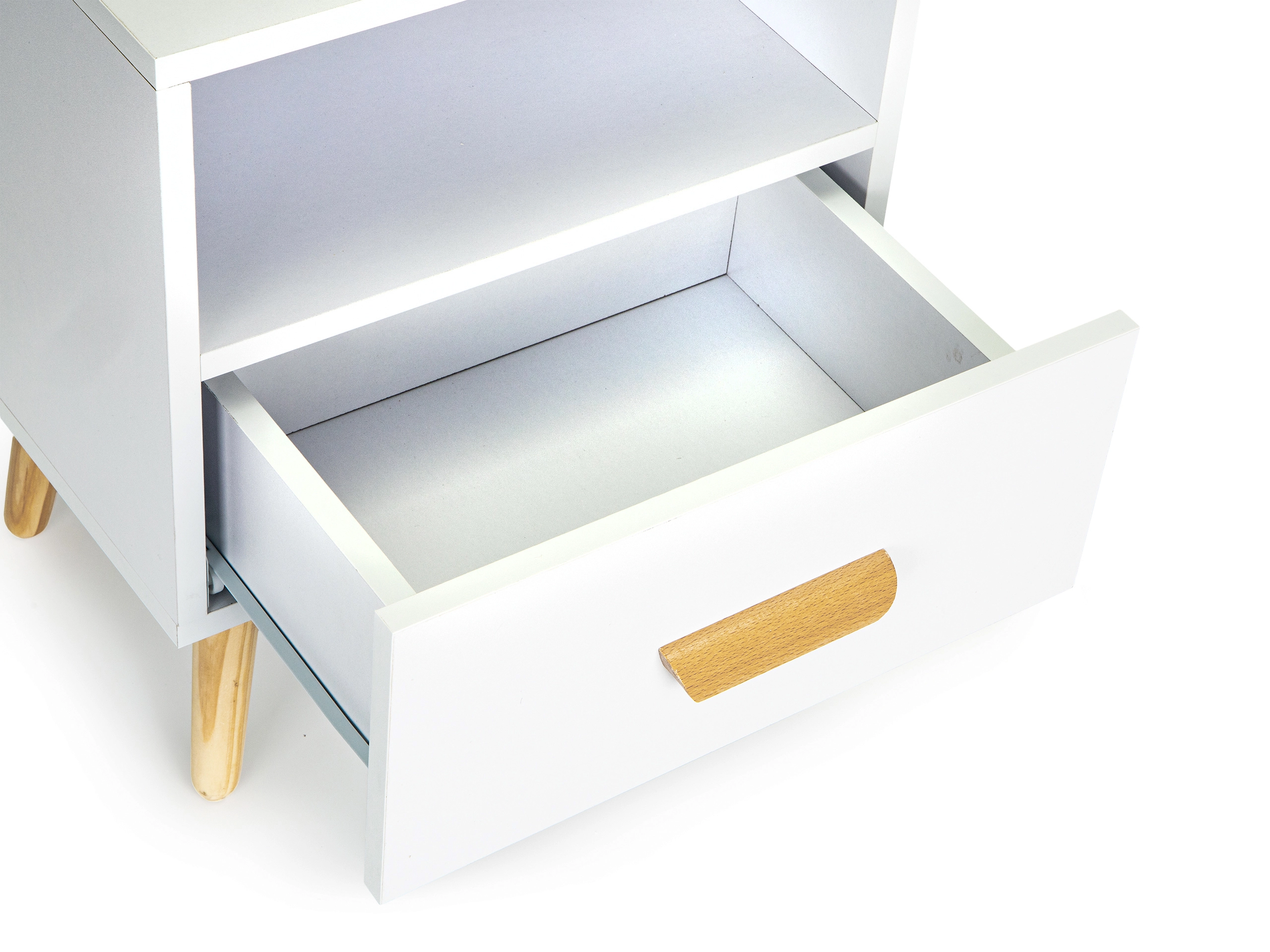 Kvalitetna izrada počiva na čvrstim nogama od borovog drva i laminiranoj ploči, koja je otporna na ogrebotine i obojenja. Praktična ladica čuva sitnice uredno posložene i lako dostupne.