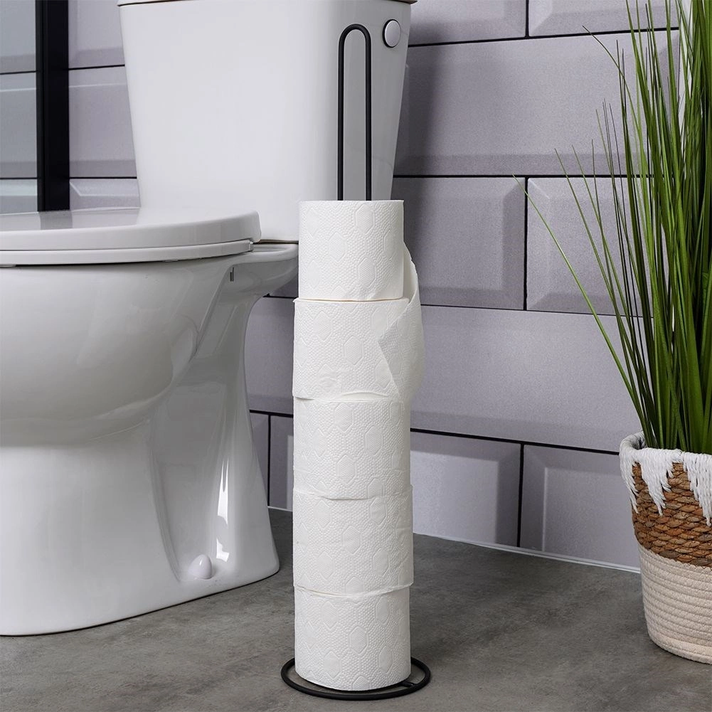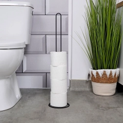 Samostojeći stalak za toaletni papir u minimalističkom dizajnu spaja praktičnost i stil. Tanka konstrukcija s ručkom omogućuje udobno premještanje i brzo dopunjavanje rola. Mat crna završna obrada odlično se uklapa s modernom sanitarijom i dodacima.