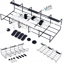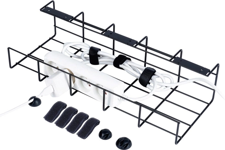 Zahvaljujući univerzalnim dimenzijama 43 × 17 × 10 cm lako stane ispod većine stolova i polica. Metal s praškastim premazom u crnoj boji otporan je na ogrebotine i odlično se uklapa u moderne interijere. Košara je idealna za smještaj produžnih letvi, napajanja i viška kabela bez njihova uvijanja i zapetljavanja.