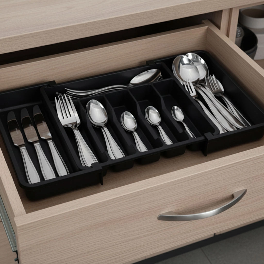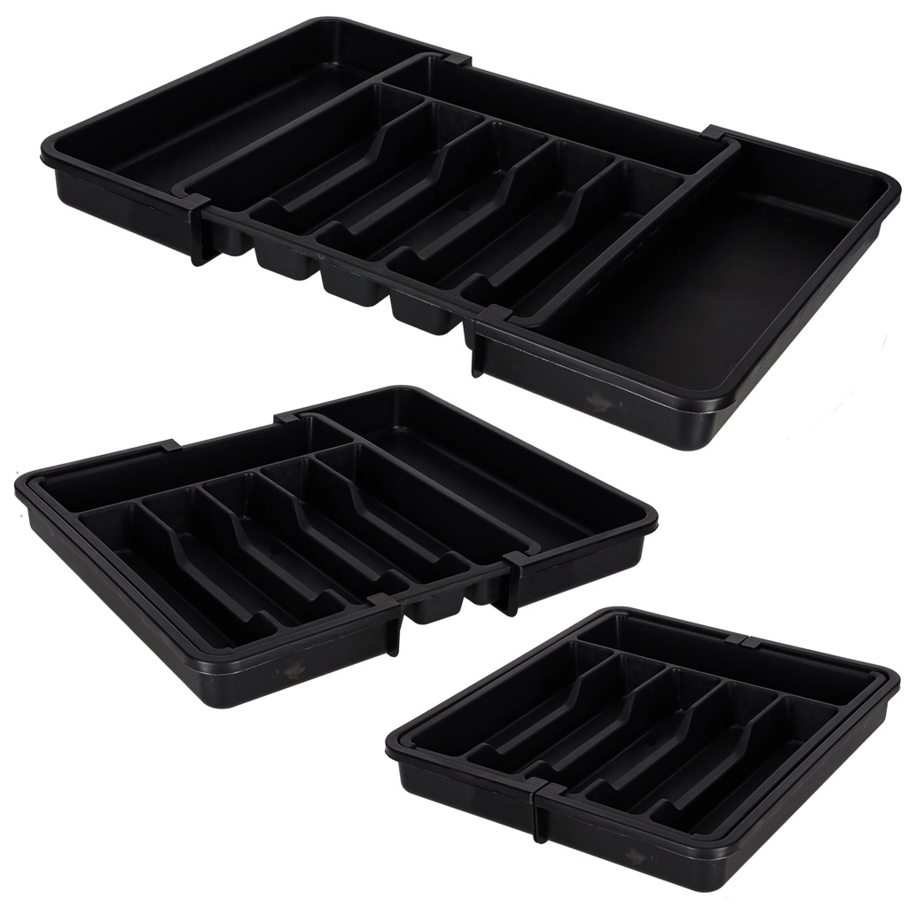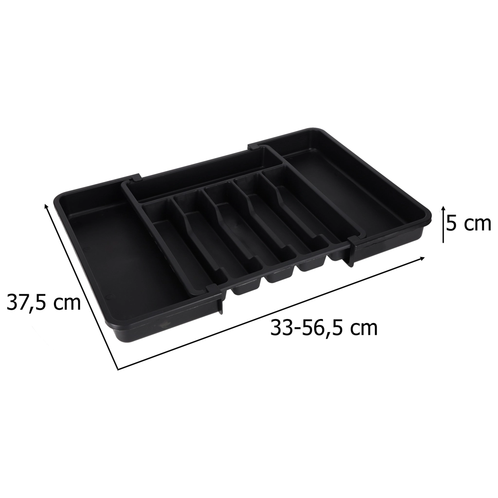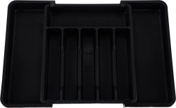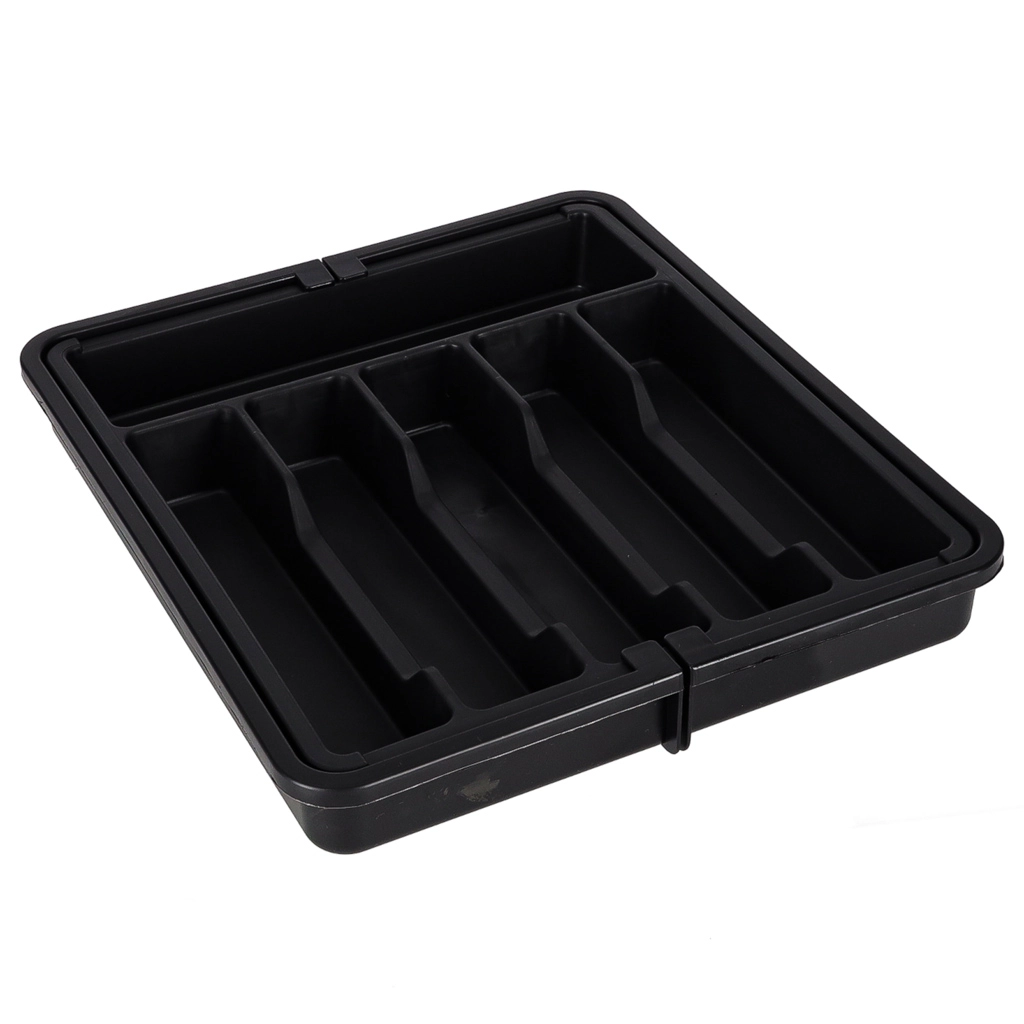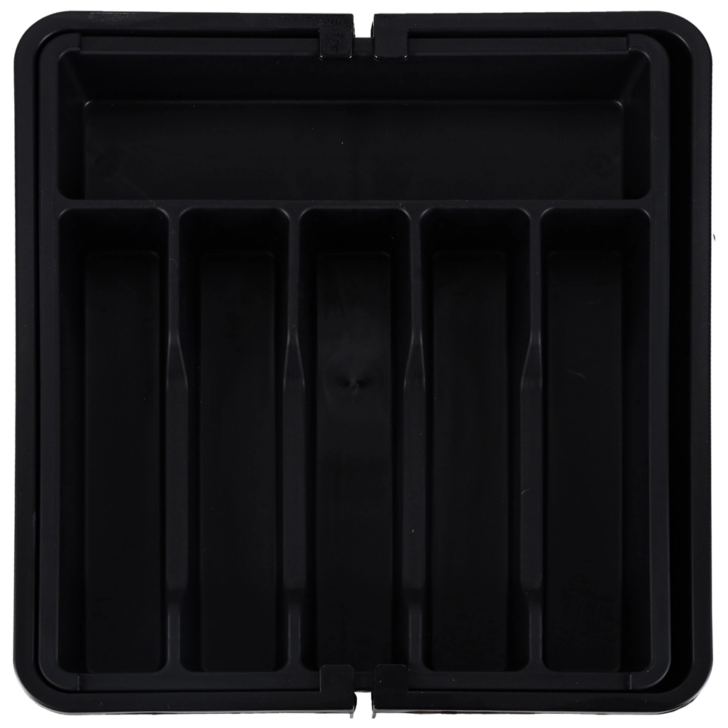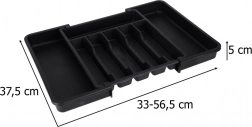 Moderan, modularan umetak za kuhinjsku ladicu pomaže maksimalno iskoristiti dostupni prostor. Klizna konstrukcija omogućuje precizno podešavanje širine, tako da se organizator savršeno uklapa u uže i šire ladice. Elegantna crna izvedba i glatke površine lako se održavaju i daju kuhinji ujednačen izgled.