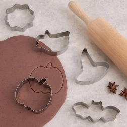 Kalupi su prikladni ne samo za tijesto, već i za fondant, marcipan ili linzer, a mogu se koristiti i za mekše namirnice poput sendviča, sira ili voća – za efektno posluživanje djeci i na zabavama. Set je pričvršćen na dekorativni karton u obliku bundeve – sjajan poklon za ljubitelje domaćeg pečenja.