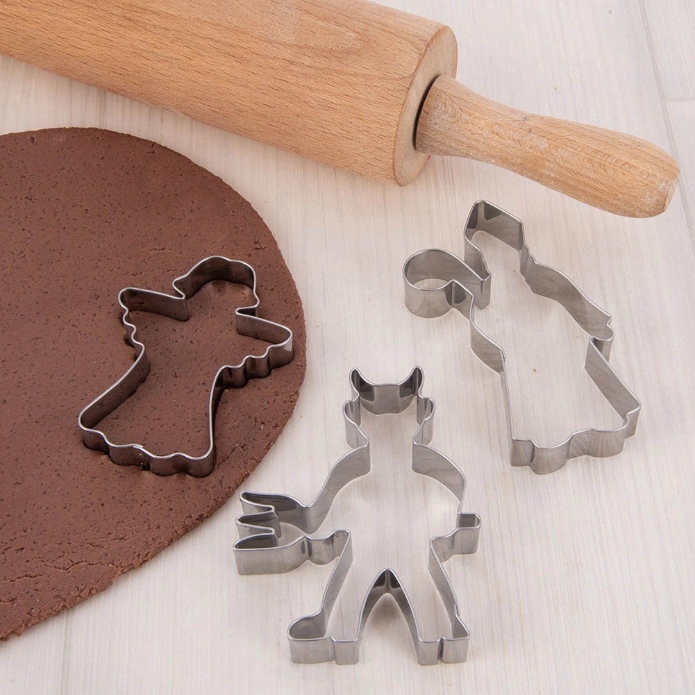 Stilizirani set od 3 kalupa donosi pravu blagdansku atmosferu u vašu kuhinju. Zahvaljujući čvrstoj izradi od nehrđajućeg čelika, lako ćete oblikovati precizne konture i glatke rubove medenjaka i keksa. Kalupi su izvrsni i za fondant, marcipan ili tijesto za kekse.