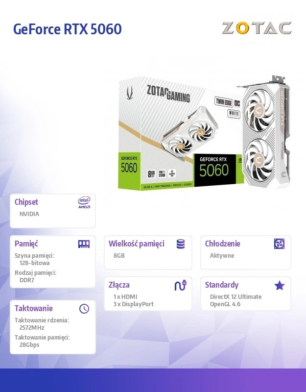 Uživajte u modernom PC igranju s karticom ZOTAC GAMING GeForce RTX 5060 Twin Edge OC White – kompaktnim modelom s tvorničkim overclockom koji spaja visok učinak, niske temperature i elegantno bijelo izvedbu. Zahvaljujući arhitekturi NVIDIA Blackwell i tehnologijama kao što su DLSS 4 i ray tracing dobit ćete više sličica u sekundi i detaljnu sliku čak i u zahtjevnim igrama.