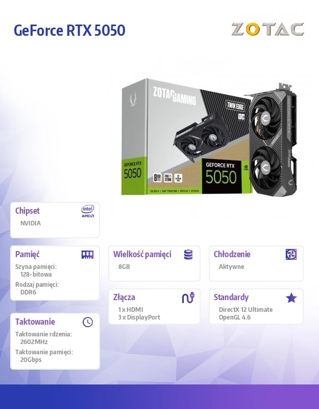 ZOTAC GAMING GeForce RTX 5050 Twin Edge OC dizajnirana je za igrače koji traže kompaktno, ali moćno grafičko rješenje. Moderna NVIDIA Blackwell arhitektura i tehnologija DLSS 4 omogućuju više sličica u sekundi, čišću sliku i glađe igranje u Full HD i QHD rezoluciji.