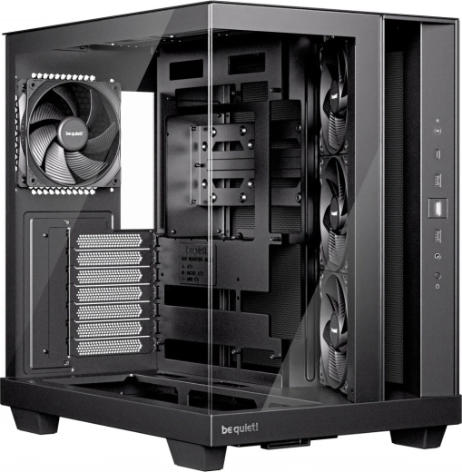Light Base 500 Black donosi promišljen airflow s kutnim, izvlačnim okvirom ventilatora koji usmjerava hladni zrak izravno na GPU. Ventilatori se mogu ugraditi u sniženu kadu za idealno poravnanje s dnom kućišta, dok kanal za kabele održava unutrašnjost čistom i preglednom. Četiri tiha ventilatora Pure Wings 3 120 mm PWM optimizirana su za visok protok i nisku buku – bočne jedinice s obrnutim lopaticama dodatno izgledaju odlično kroz perforaciju.