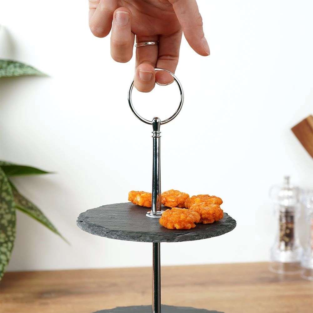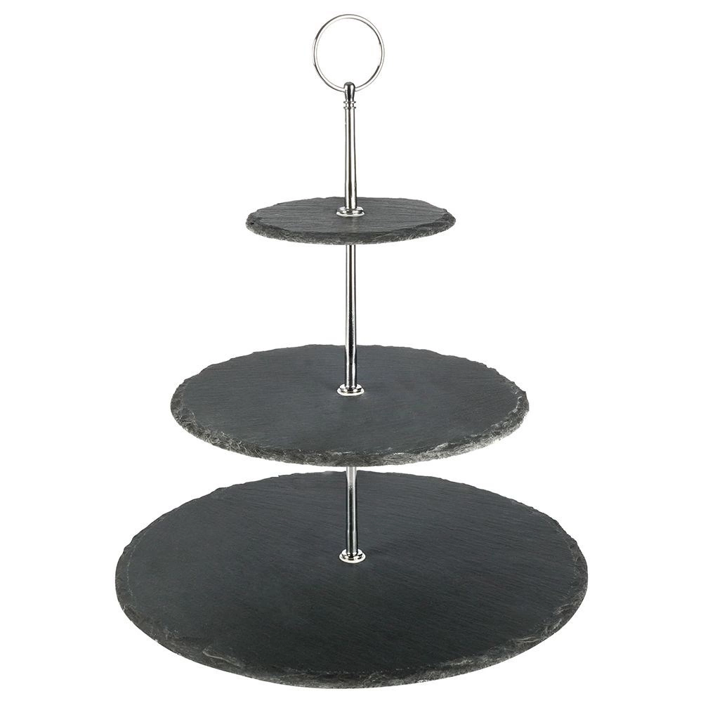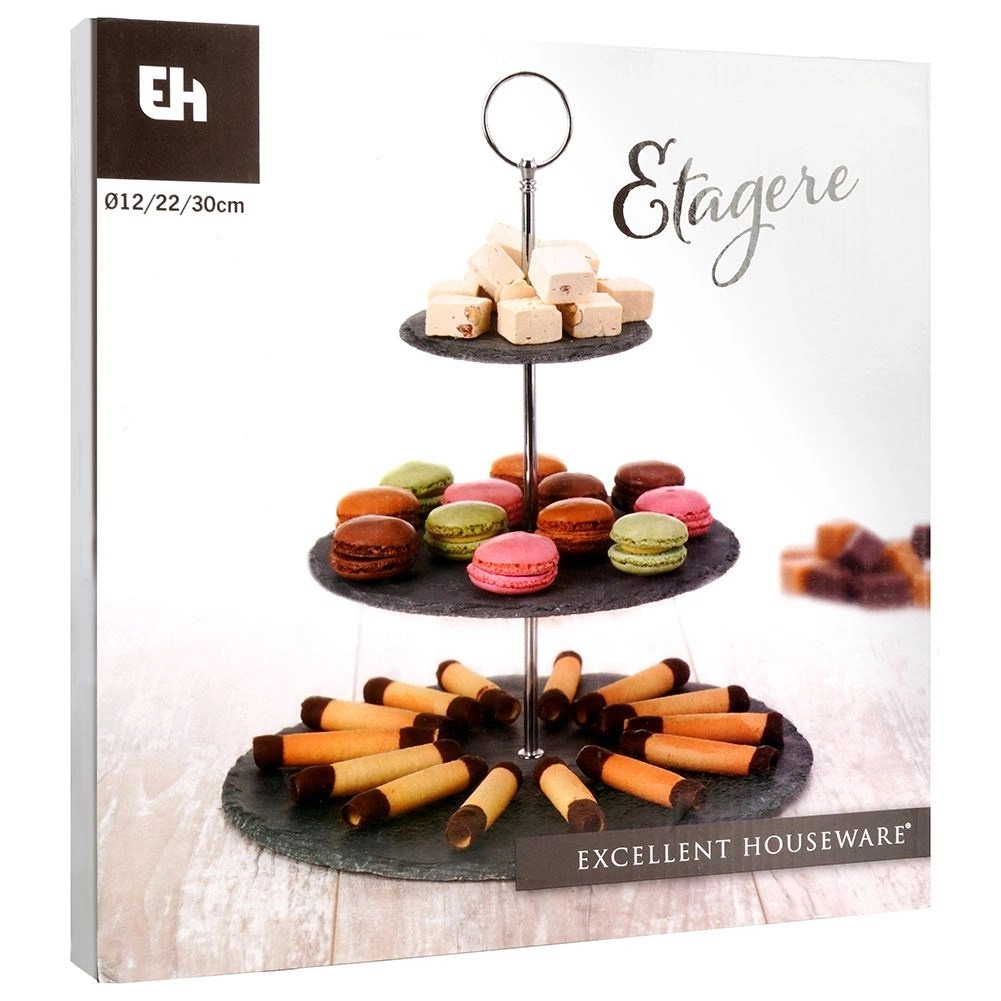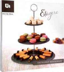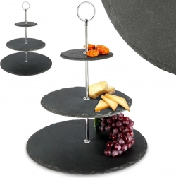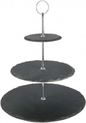 Elegantna troslojna etažer-misica od crnog škriljevca daje vašem stolu moderan, prirodan izgled. Idealna za posluživanje cupcakeova, keksa, makarona, sireva, voća i slanih zalogaja. Zahvaljujući praktičnom gornjem prstenu lako je prenesete iz kuhinje na stol.
