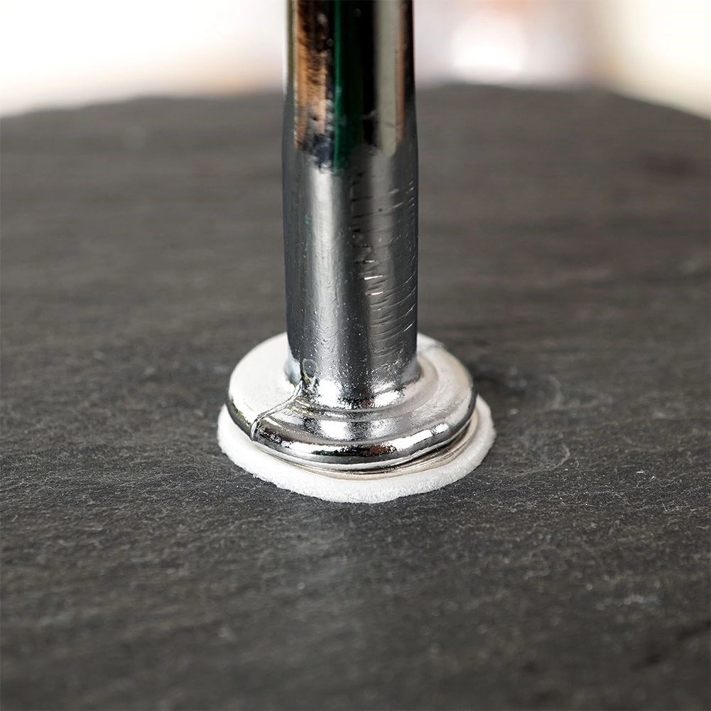Robusni kameni tanjuri i čvrsta metalna šipka u kromiranom izgledu osiguravaju stabilnost, dok četiri zaštitne podloške štite stolnu plohu od ogrebotina. Sklopiva konstrukcija omogućuje brzo sastavljanje i kompaktno spremanje kada trenutno ne poslužujete.