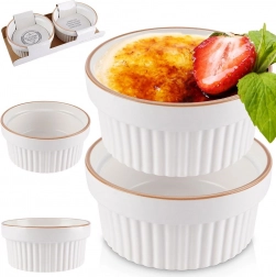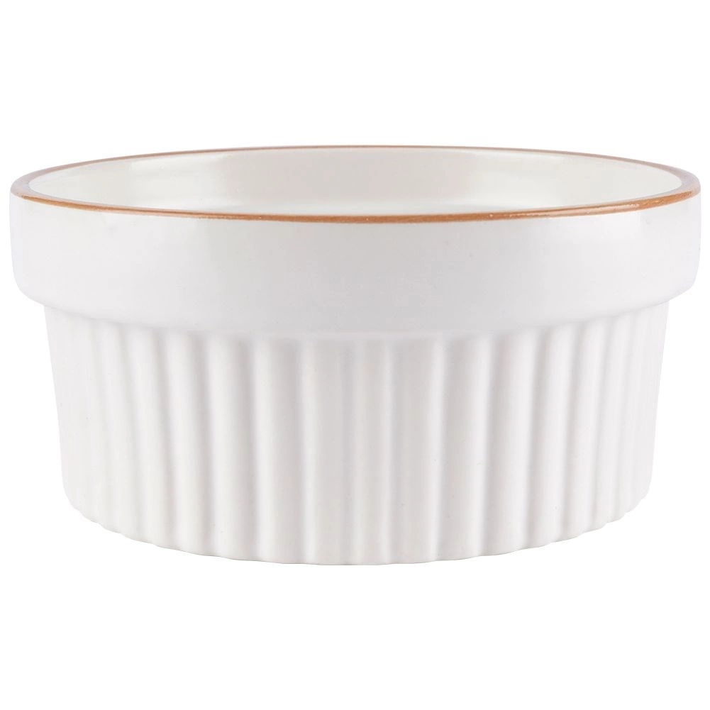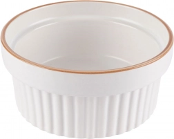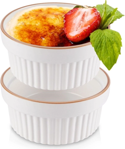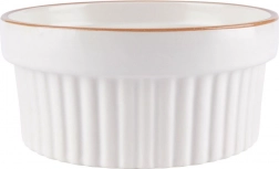 Bijele porculanske ramekin zdjelice s nježnim bež rubom i vertikalnim rebrima daju vašim desertima i slanim jelima profesionalan izgled.